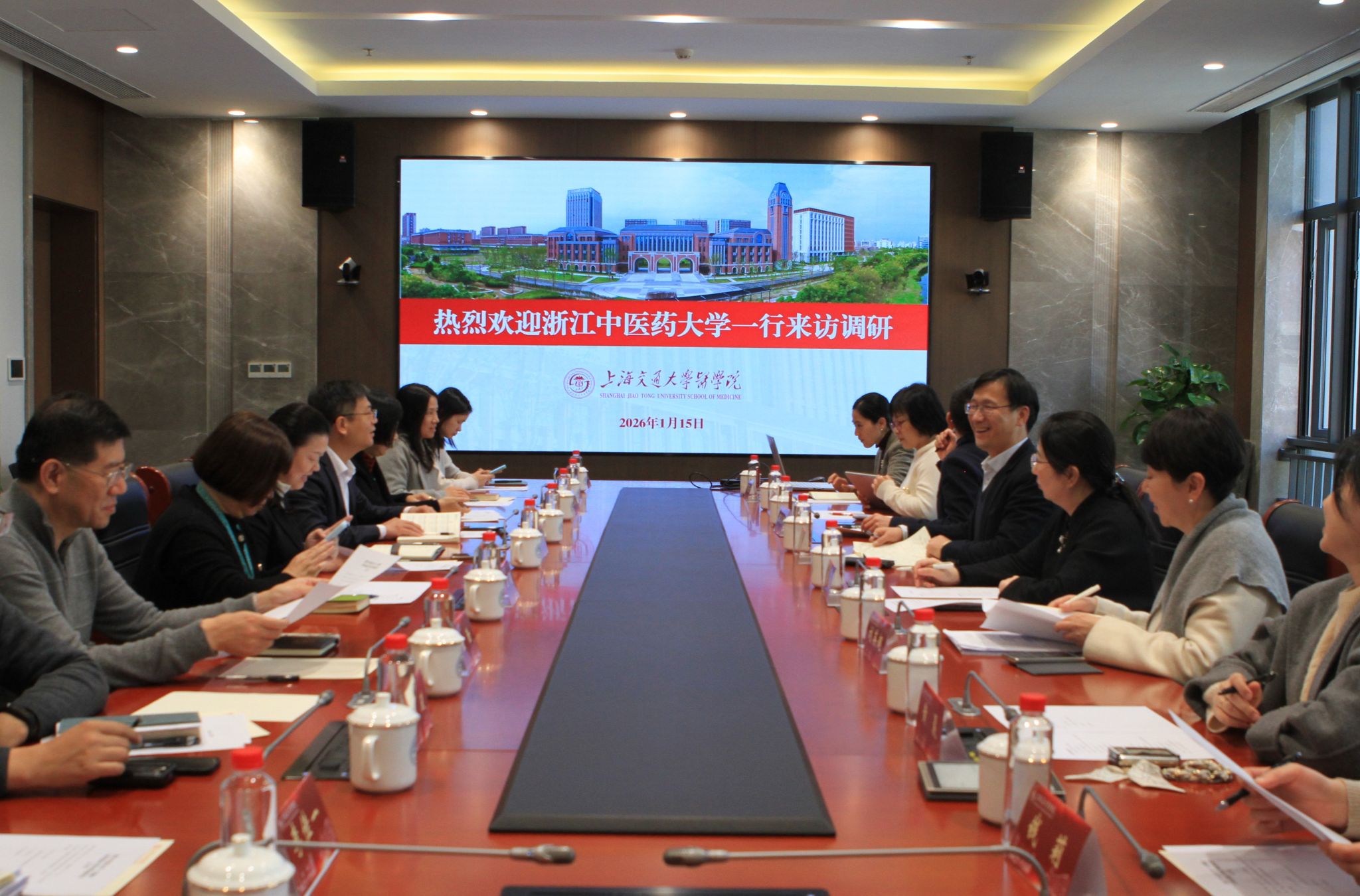 1月15日下午,浙江中医药大学黄建波副校长一行来上海交通大学医学院调研。上海交通大学医学院副院长毕宇芳,院长办公室、教务处、医院管理处、财务处、研究生院、附属仁济医院临床医学院、网络信息中心等相关部门同志出席座谈会。会议由毕宇芳副院长主持。