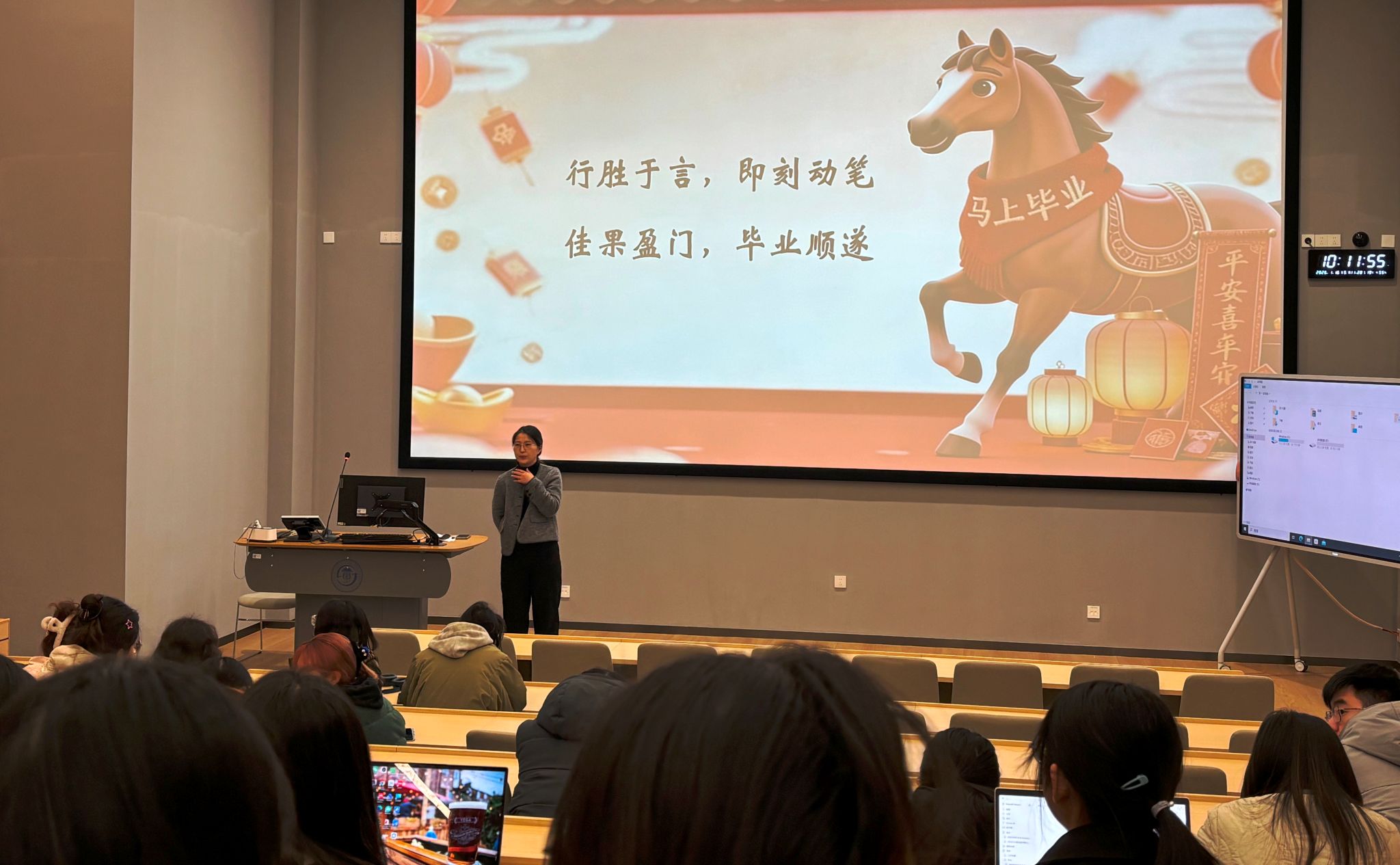 1月16日上午,面向学院毕业班研究生、答辩秘书、系秘书及指导教师,在浦东校区东8-416教室组织召开2026年研究生论文答辩及学位申请说明会。围绕毕业证书与学位证书获得要求、答辩及学位申请主要环节、学位论文撰写要求、时间节点与学业安排等重要内容,教学办张悦恬对学位申请全流程进行了细致梳理,重点解读了学位论文撰写规范、双盲评阅、答辩流程以及学位材料提交等关键环节的政策要求与常见问题。说明会紧扣“提升学位论文质量”这一核心目标,通过提前明晰标准、划清红线,旨在引导学生重视学位论文质量,在论文撰写与修改阶段即对标最高要求。