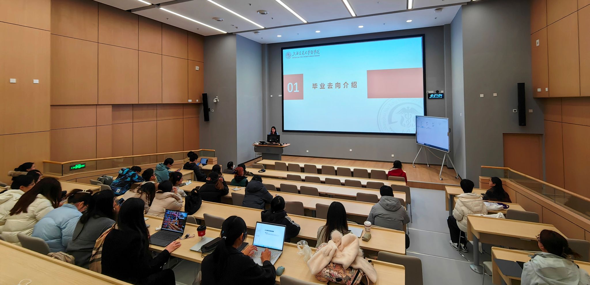 随后,教学办刘天颖讲解2026届毕业生就业工作,围绕学院毕业生去向、上海户籍申请、就业协议签订等展开详细讲解,她着重分析了基础医学院毕业生就业特征和求职关键窗口,并提醒毕业生在就业过程中强化自我保护意识,秉持“早决定、早行动、早落实”的原则,主动发掘多元就业渠道。此次班会为毕业生提供了清晰的就业指引。