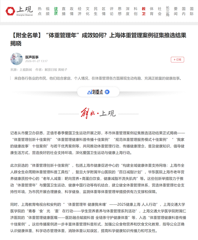 在最新揭晓的2025年度上海体重管理案例征集推选结果中,由上海交通大学医学院报送的《青春“食”光 “重”在行动——学生营养素养与体重管理系列活动》成功入选“体重管理健康科普传播十佳案例”。该案例源于上海交通大学医学院第十九期“大学生创新训练计划”项目(19250042)成果,由公共卫生学院朱静芬副教授指导,预防医学专业的吉颖、李文翠、余芷磊、叶尔阿斯力·叶尔扎提、景思函同学共同完成。