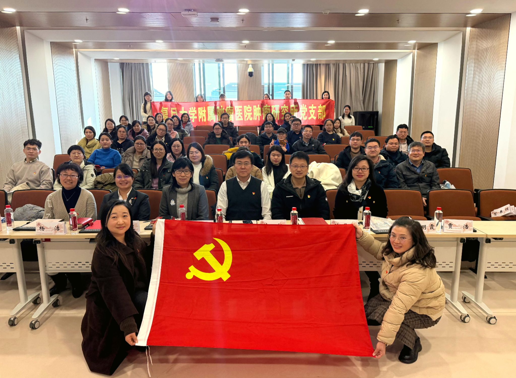 为深入贯彻落实新时代党的建设总要求,发挥全国高校“双带头人”教师党 支部书记“强国行”专项行动的支部联学联建作用,通过党建引领、学术联动、资源共享,进一步提升党组织凝聚力与战斗力,促进学科交叉融合与科研协同创新,基础医学院生物化学与分子细胞生物学系党支部(生化细胞系党支部)与复旦大学附属肿瘤医院肿瘤研究所第一、第二党支部开展共建活动。复旦大学附属肿瘤医院党委大部主任董枫、外联发展中心主任陈勇波,附属肿瘤医院肿瘤研究所第一党支部书记唐爽、第二党支部书记闫明霞,基础医学院党委副书记张晓波、基础医学院生化细胞系党支部书记杨洁、副书记贾浩,以及双方党员近80人参加活动。