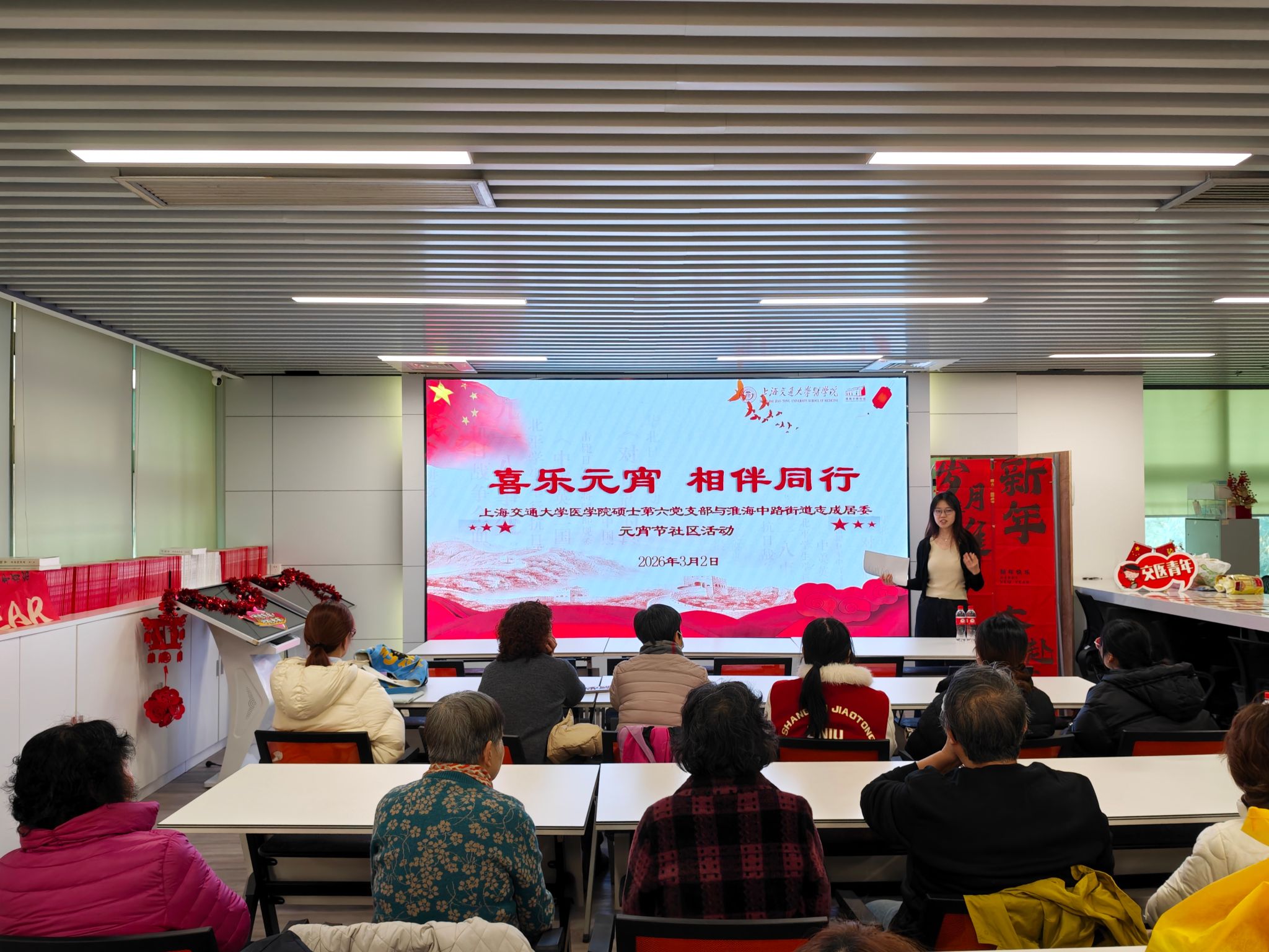 为弘扬中华优秀传统文化,探索区域化党建创新路径,同时深入贯彻落实党中央关于积极应对人口老龄化及全面推进健康中国建设的战略部署,3月2日中午,上海交通大学医学院硕士第六党支部携手淮海中路街道志成居委,精心组织开展了“喜乐元宵,相伴同行”元宵节活动,在祥和喜庆的氛围中共同感受传统节日的独特魅力。硕士第六党支部书记、基础医学硕士生李琛致开场辞,向到场的社区老人与学生党员致以节日的诚挚祝福,并就活动初衷与整体流程进行介绍,现场氛围迅速升温。