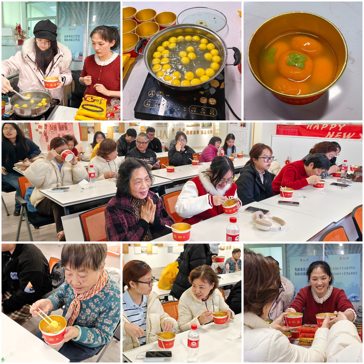 猜灯谜圆满结束后,活动来到温馨的“共品汤圆”环节。工作人员递来热气腾腾的汤圆,圆润饱满的汤圆承载着团圆美满的美好寓意。大家围坐在一起,吃着甜糯的汤圆,聊着家长里短,分享着生活中的点滴。对于很多老人来说,这碗汤圆里包裹的不仅是芝麻馅儿的香甜,更是晚辈的陪伴与关怀,也让学生党员真切体悟到“尊老、敬老、爱老”这份传统美德沉甸甸的分量。活动尾声,全体参与人员集体合影留念,用镜头定格幸福瞬间,留存本次元宵活动的温暖记忆。