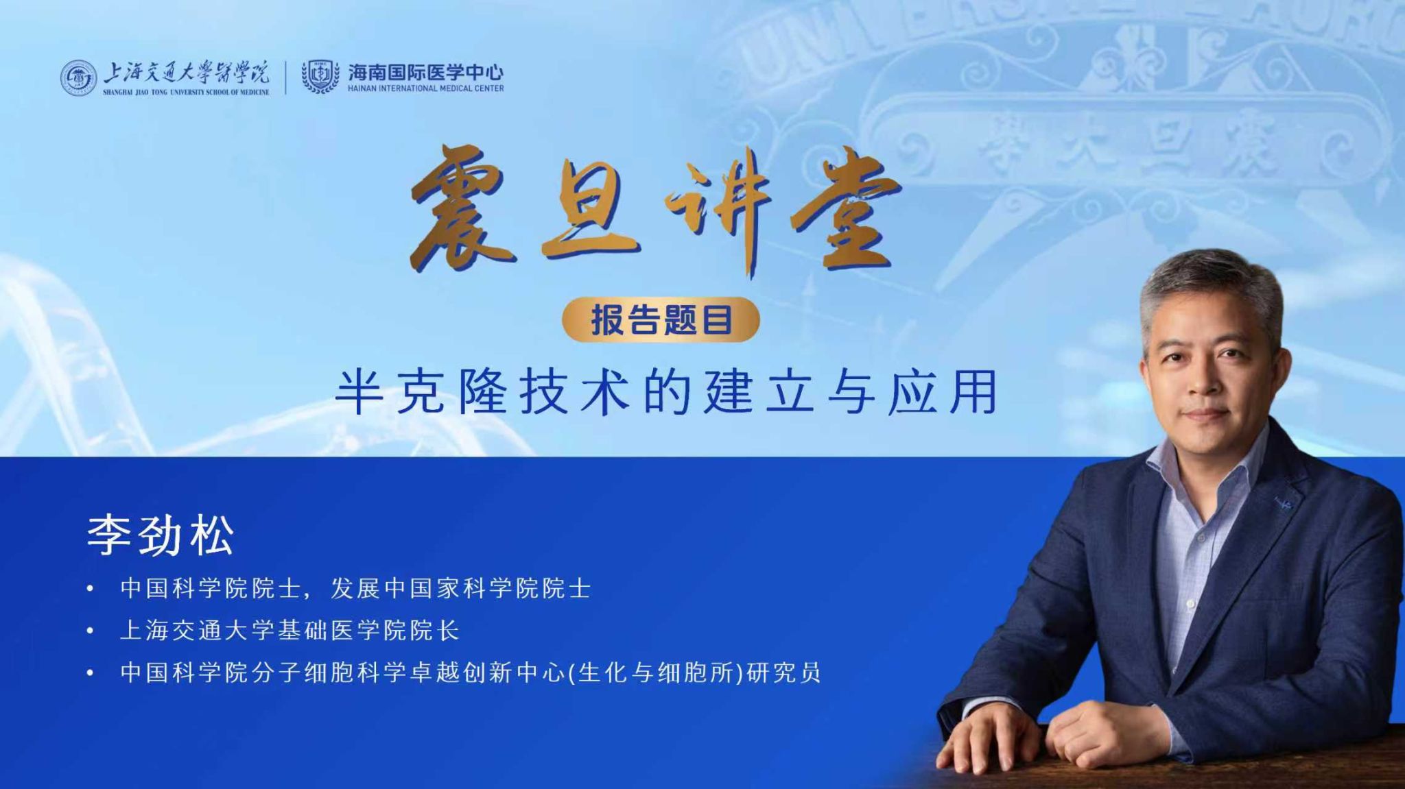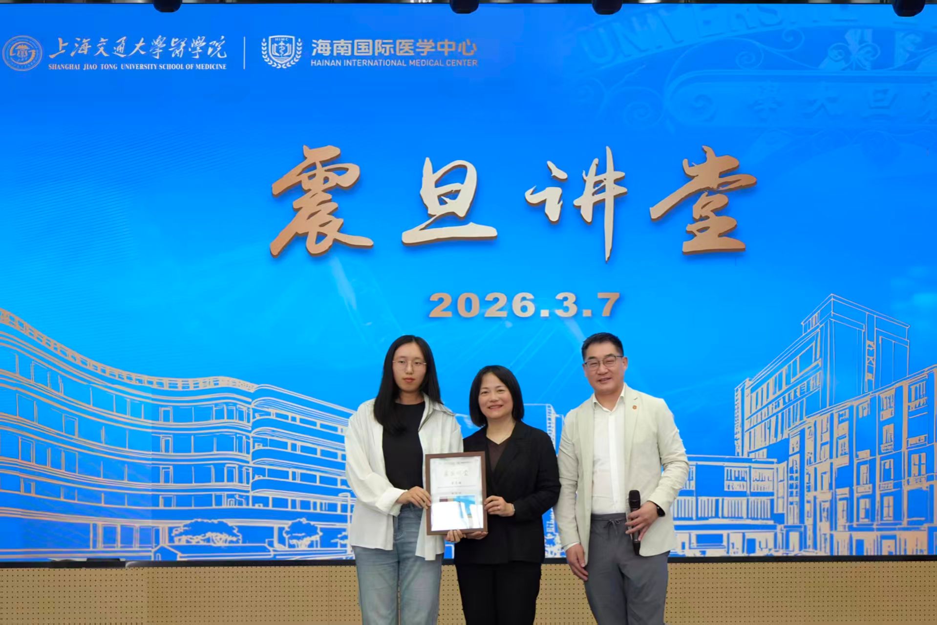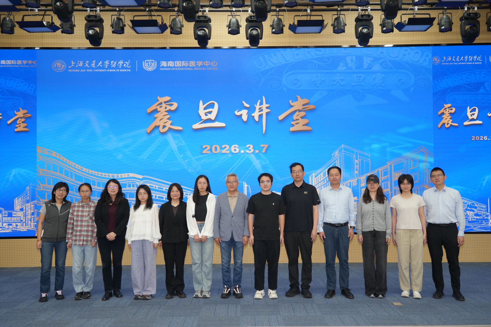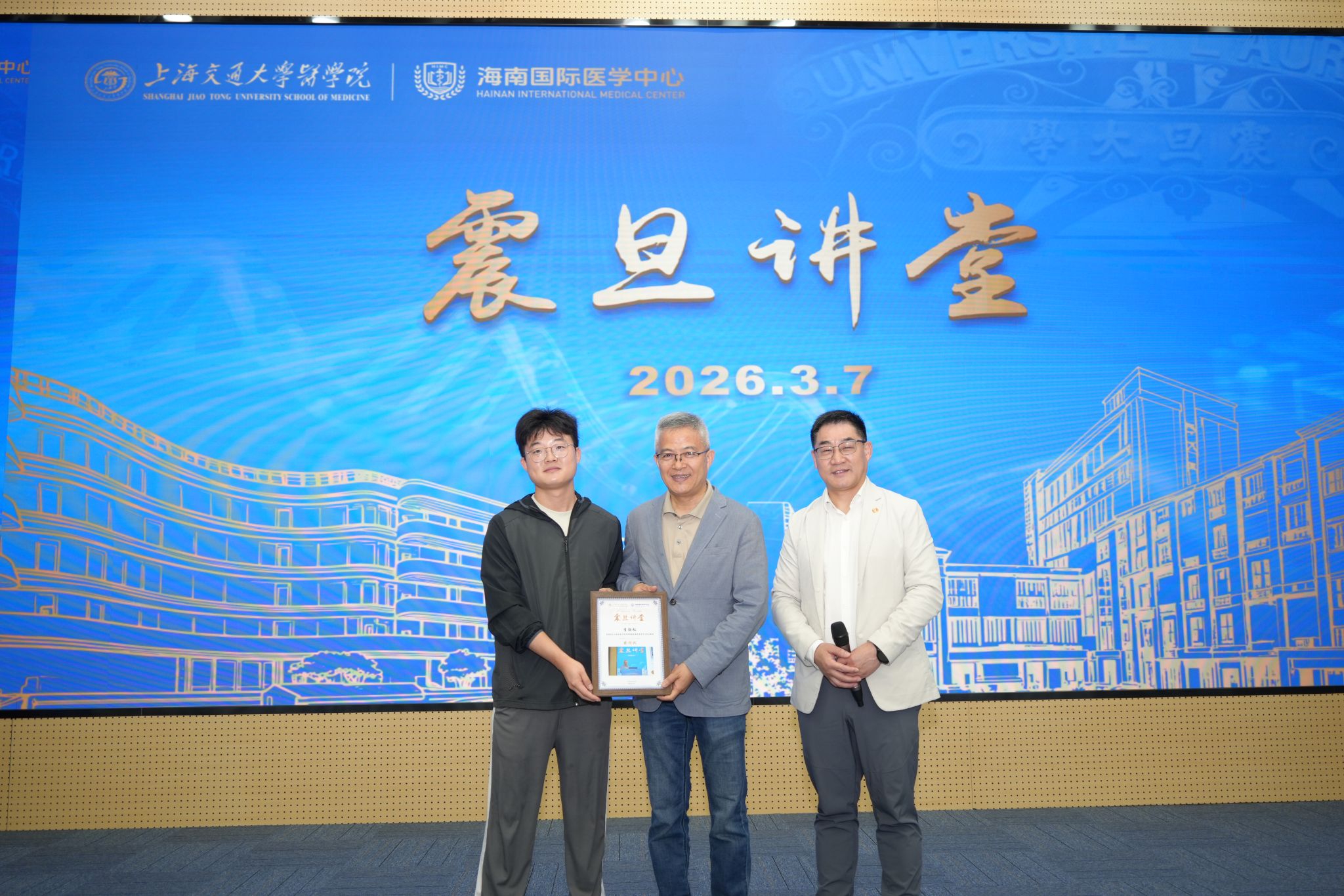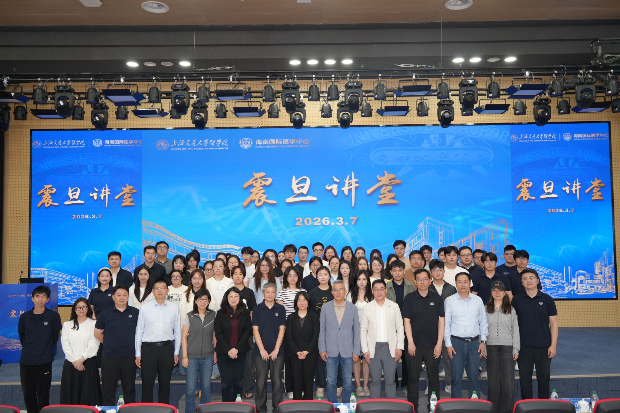 调研期间,首期"震旦讲堂"在海南校区报告厅正式开讲。讲堂以医学院前身震旦大学医学院之名命名,寓意传承百年教育薪火,照亮新时代医学创新之路。李劲松、童雪梅及基础医学院病理生理学系特聘教授钟清分别作主旨报告,为现场师生带来一场学术盛宴。