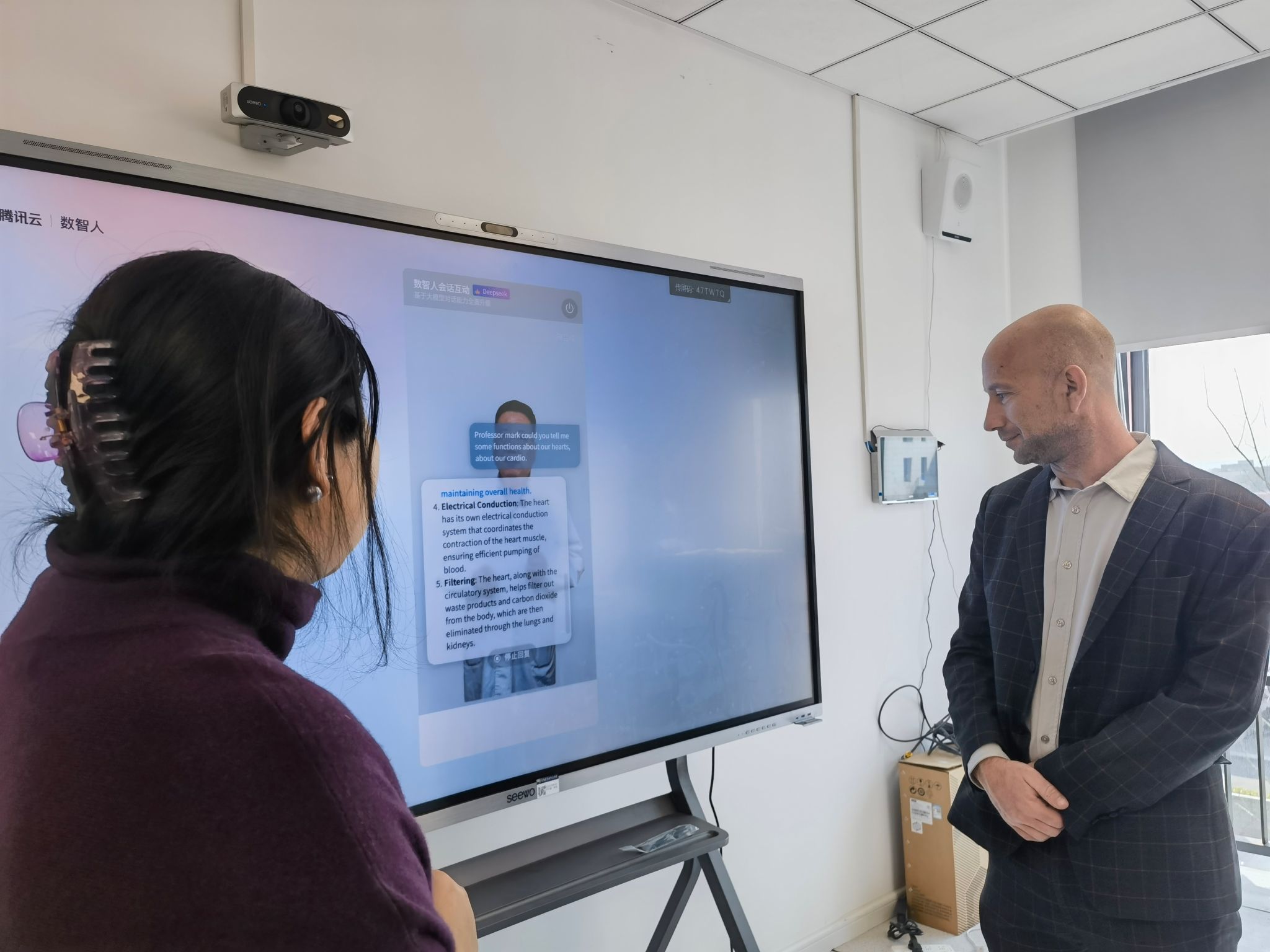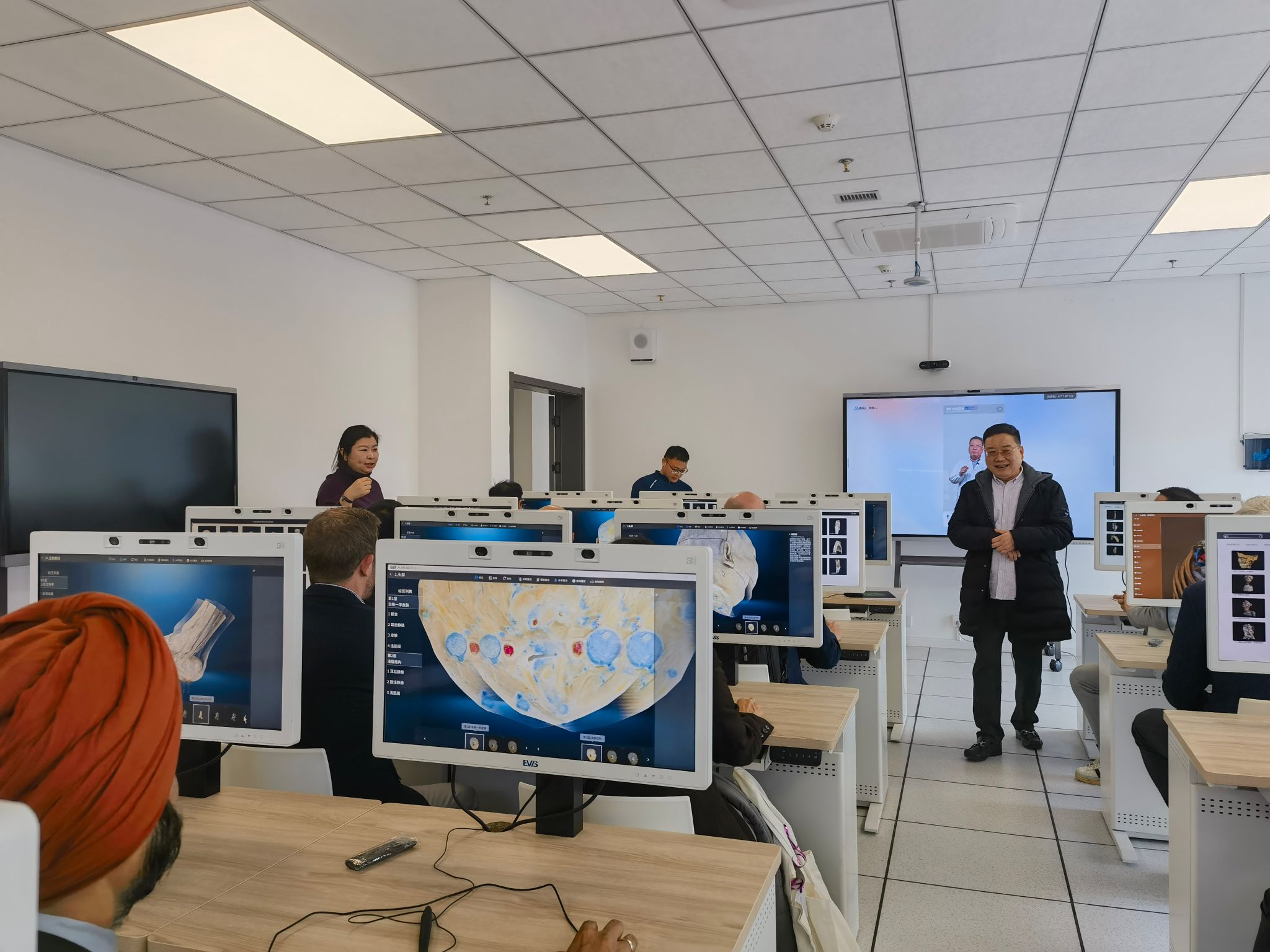 代表团首先参观了医学院周浦新校区,来到生命科学馆,解剖生理学系党支部书记、课程首席沃燕,系副主任马爱荣和李岩老师向来宾演示了3D裸眼解剖系统的操作应用,展示了与“数智人”智能会话的互动技术。来宾们对人工智能在解剖学教学中应用表现出浓厚兴趣。随后,代表团一行实地走访基础医学实验教学中心,先后参观了数字互动实验教室,机能及人体实验室,并观摩了现场的课堂教学。中心主任戎伟芳,支部书记许伟榕及骨干教师陈荪红,黄晨等陪同参观。双方就埃德仪器相关设备在教学一体机中的实际应用进行了深入交流 。