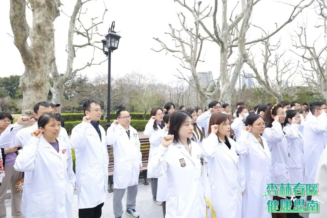 在附属瑞金医院心脏外科青年医师杨溢、附属仁济医院肾脏科青年医师林其圣、附属第一人民医院泌尿外科青年医师邵佳亮、附属国际和平妇幼保健院生殖医学中心青年医师陈露婷、附属同仁医院眼科青年医师龚莹莹的带领下,现场全体青年医师与医学生郑重宣读《志愿者誓词》。庄严的宣誓声,展现了新时代交医青年传承志愿服务精神、恪守“健康所系,性命相托”誓言,以专业服务社会、以奉献书写担当的坚定决心。