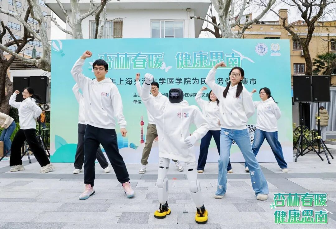 仪式开场,一台身着白色卫衣的智能机器人炫酷亮相,带领一群医学生跳起健康操,瞬间点燃现场气氛。这台来自附属第九人民医院血管外科“久脉”健康科普项目的“AI私教”,由团队青年自主编写代码、精细调节动作,让AI赋能健康,为科普注入活力。和着欢快的音乐节拍,现场市民跟随着机器人“领操员”也饶有兴致地跃动起来。