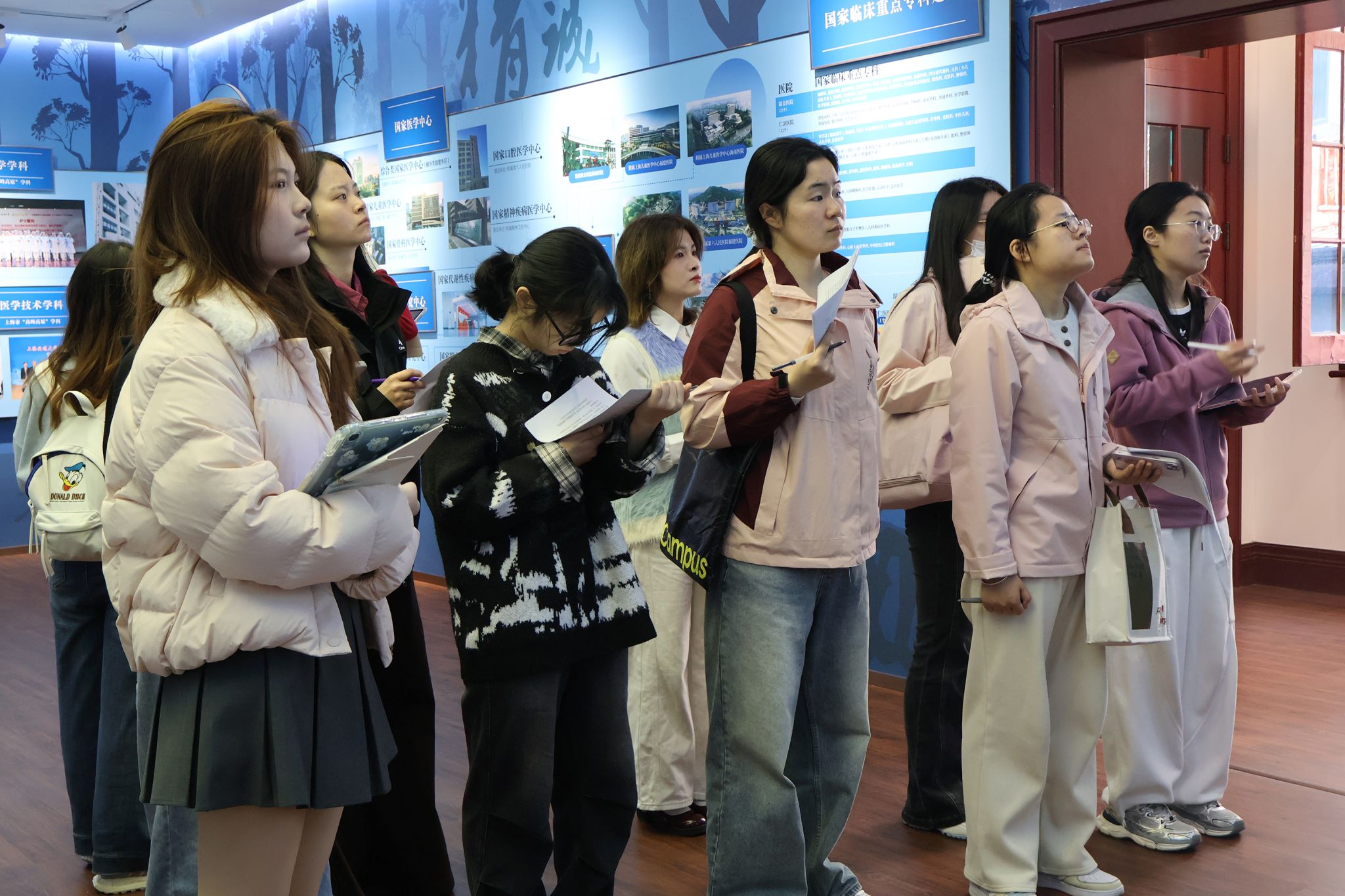 培训伊始,讲解员、临床医学五年制本科生陈宸进行了完整的示范讲解。她依循院史馆展陈脉络,从学院创办之初娓娓道来,贯穿重要历史节点、杰出校友事迹、教学科研成果,以及附属医院建设等内容,展示了标准讲解的节奏与章法。