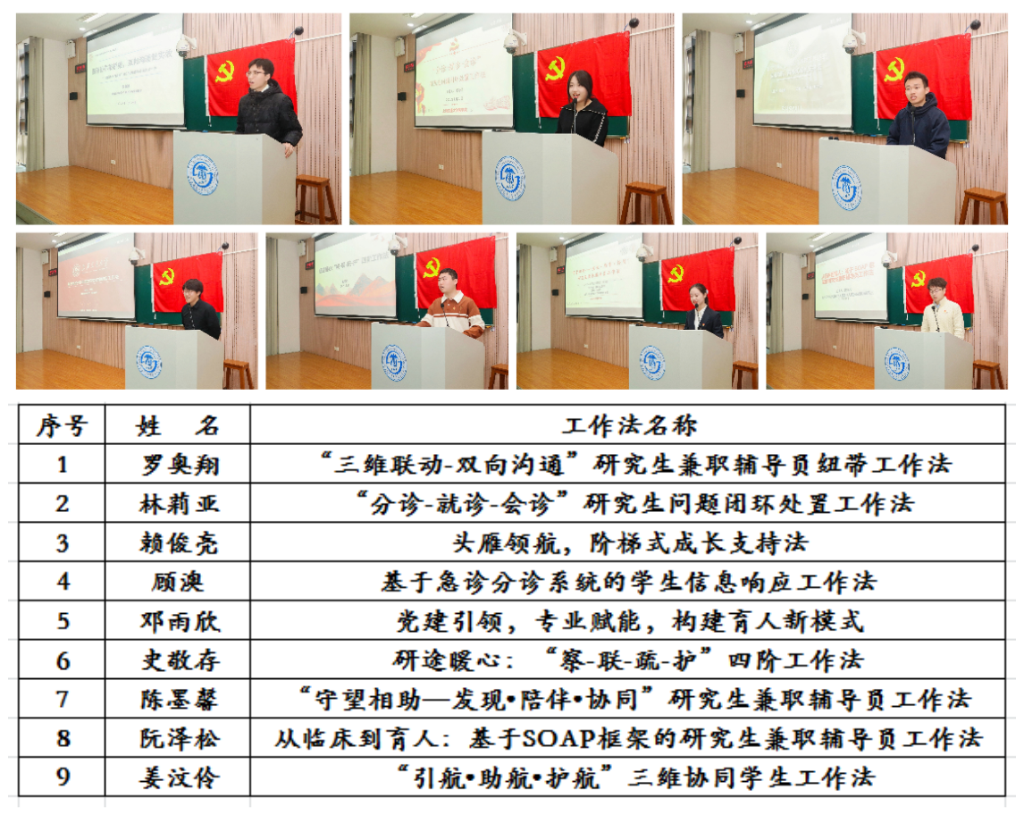 本次述职汇报创新性地以“兼职辅导员工作法”为载体,来自不同培养单位的12位研究生兼职辅导员依次登台,围绕思想引领、班风学风建设、心理健康关怀、职业发展指导、日常事务管理及突发事件应对等多个方面,分享了各自在实践探索中凝练的特色工作方法与深刻感悟,实现了经验的有效沉淀与共享。