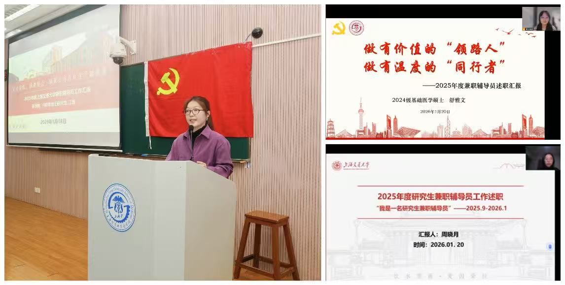 为总结深化工作经验,提升思政育人实效,2026年1月20日,2025年度医学院研究生兼职辅导员工作述职在黄浦校区西2楼317教室顺利举行。学指委副秘书长、研究生党总支书记郭莹莹,特邀党建组织员李国瑛、高蕴雅,研究生党总支专职辅导员,以及2025级研究生党支部书记、支部委员现场参会。述职由上海市“医道同行”辅导员工作室及交大医学院“研途指南”辅导员工作室联合举办。