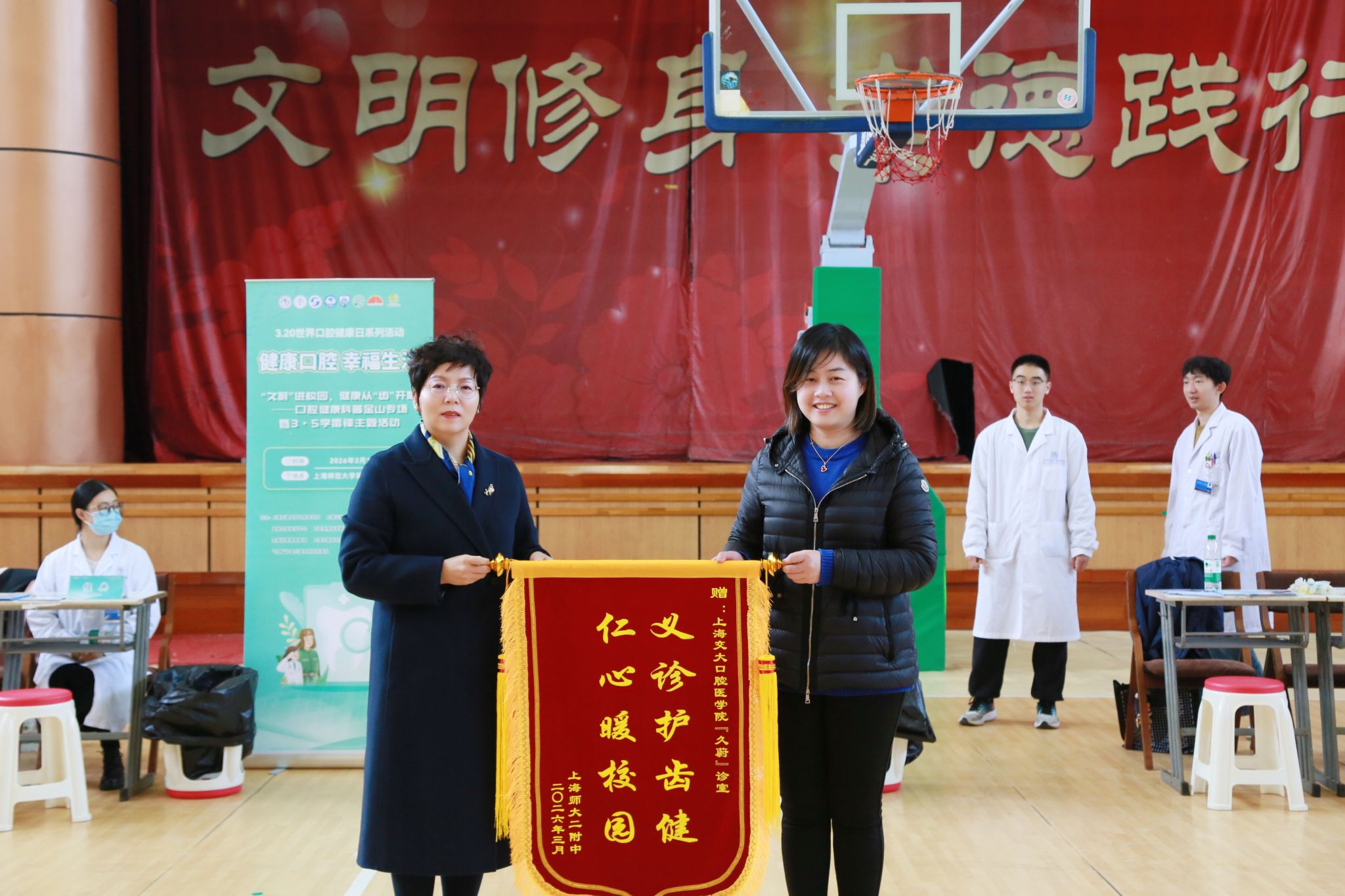 活动伊始,蔡鸣作为上海师大二附中校友向学校赠送了我院编写出版的口腔科普书籍。校长蔡文代表学校向“久蔚”诊室公益项目团队赠送锦旗,“义诊护齿健,仁心暖校园”表达了对热心公益、业务精湛的“久蔚”诊室公益项目团队的真诚感谢。
