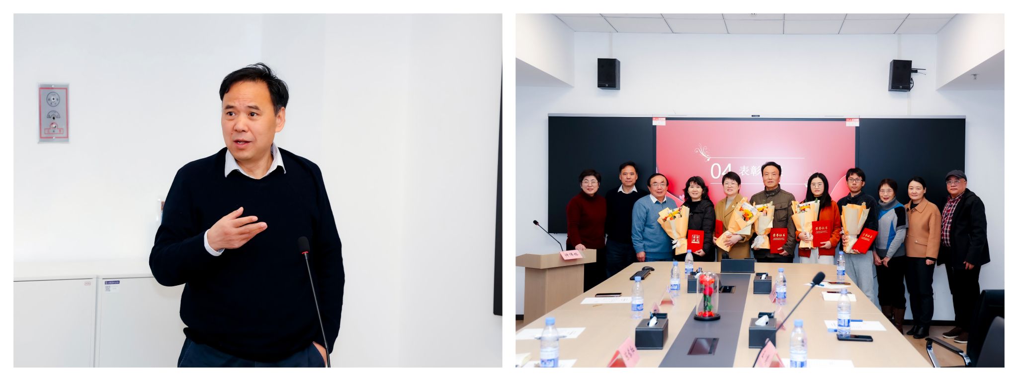 会议进入年度总结与表彰环节。中心主任戎伟芳首先作2025年度工作报告,系统回顾了中心在教育教学、实验室建设等方面取得的显著成效,并对2026年重点推进的课程体系改革工作作出具体部署。在表彰环节,中心书记许伟榕宣读了2025年度优秀员工表彰决定。黄心智、冯雪梅、夏青、蔡玉兴和袁臻东五位老师凭借突出的工作表现获此荣誉。基础医学院领导及教学督导为获奖教师颁发荣誉证书,全场响起热烈掌声。黄心智老师作为优秀员工代表上台发言,对大家给予的认可表示感谢。此次总结表彰既是对过去一年工作的充分肯定,更是对未来发展的有力动员。