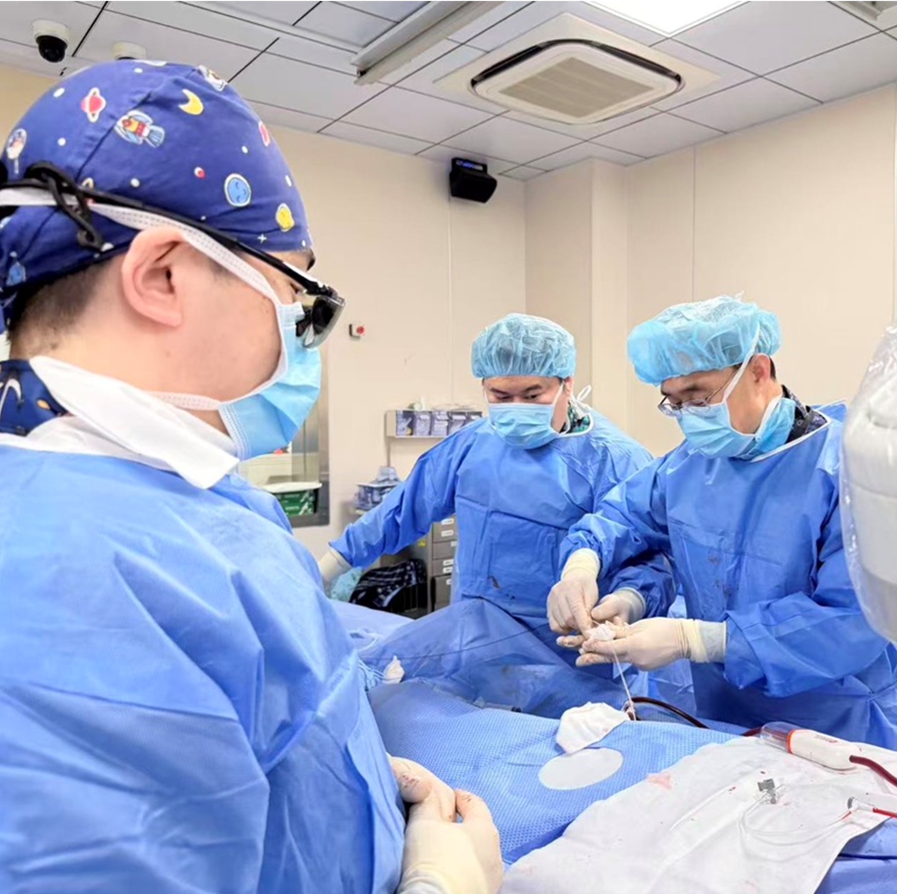 手术当天,超声医学科副主任医师夏建国对颈动脉手术区进行了精准定位。随后,赵兵和神经外科主任医师戴炯凭借娴熟的操作技巧,顺利暴露颈动脉并建立手术通路,连接血流逆转系统,在最短时间内完成了颈动脉手术治疗。