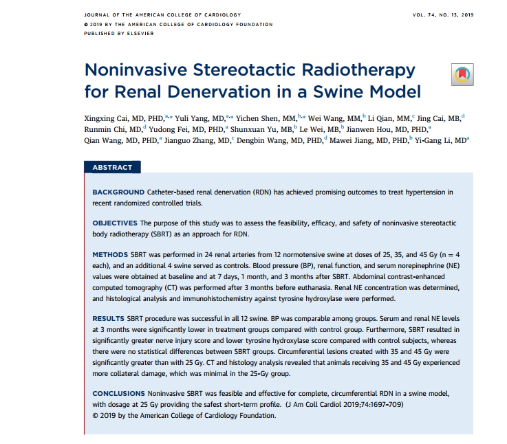 论文全文链接:Noninvasive Stereotactic Radiotherapy for Renal Denervation in a Swine Model - ScienceDirect https://www.sciencedirect.com/science/article/pii/S0735109719361522