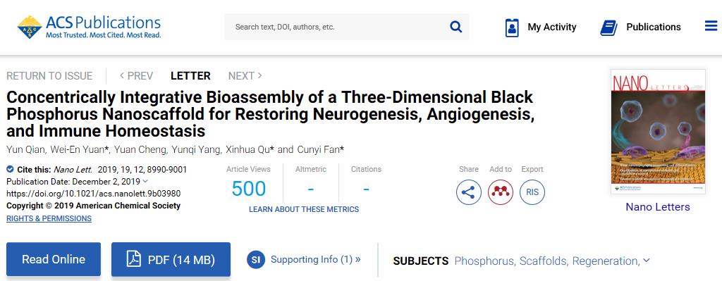 附属第六人民医院范存义课题组在《纳米快报》(Nano Letters,IF=12.279)在线发表了题为“Concentrically Integrative Bioassembly of a Three-Dimensional Black Phosphorus Nanoscaffold for Restoring Neurogenesis, Angiogenesis, and Immune Homeostasis”的最新研究成果,报道了一种负载黑磷纳米材料的聚己内酯三维支架。本项目为交大医学院首批“青年科技创新工作室”创建以来,支持发表的第一篇高水平研究论文。