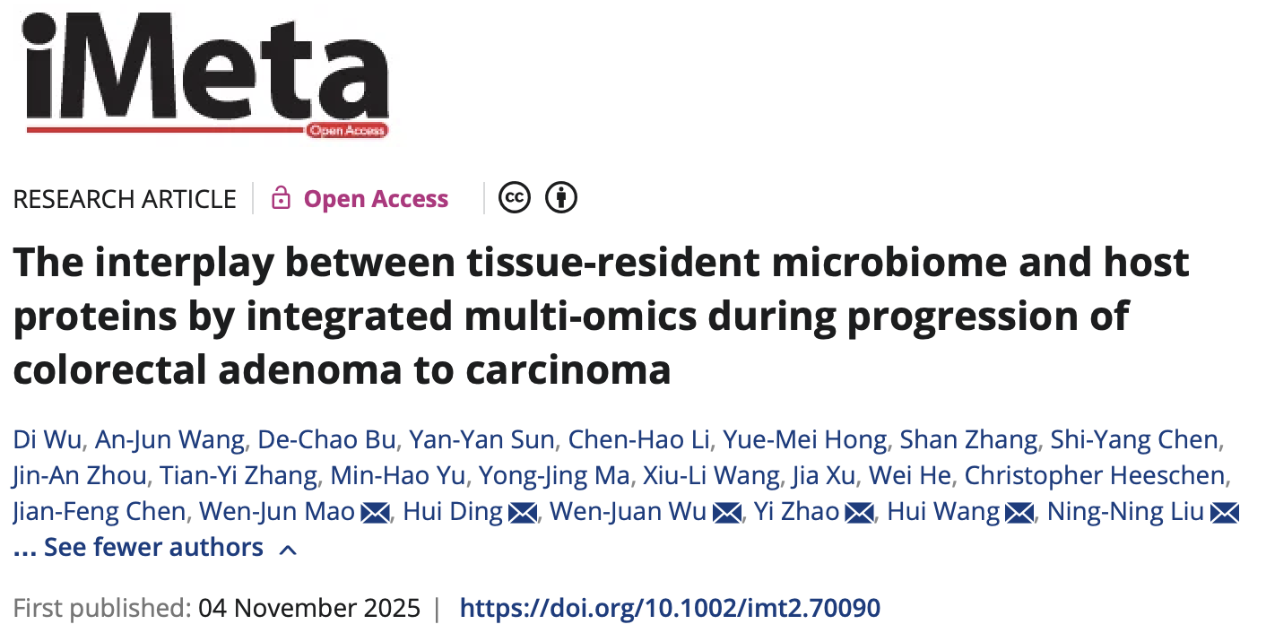 11月4日,上海交通大学公共卫生学院刘宁宁/王慧联合中国科学院计算技术研究所赵屹、同济大学附属东方医院吴文娟、上海交通大学医学院附属仁济医院丁慧、南京医科大学附属无锡人民医院毛文君等团队在国际领域知名期刊iMeta在线发表题为“The interplay between tissue-resident microbiome and host proteins by integrated multi-omics during progression of colorectal adenoma to carcinoma”的研究论文。该研究整合深度宏基因组与蛋白质组学数据,系统揭示了结直肠腺瘤-癌演进过程中组织驻留多界微生物组与宿主蛋白质组的动态互作网络,并基于此构建了高精度诊断模型,为结直肠癌的早期筛查和靶向干预提供了新靶点和新策略。