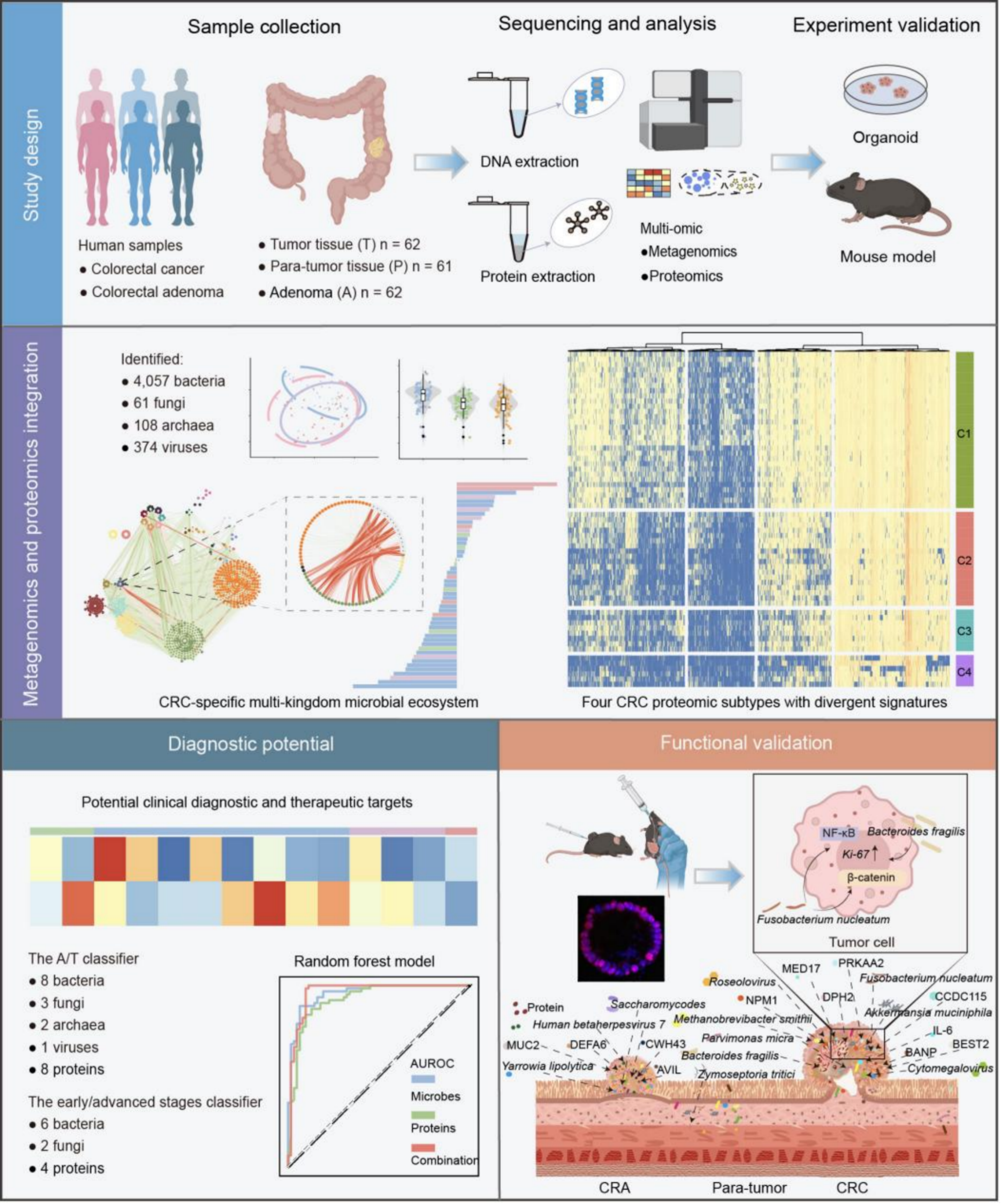 本研究构建了结直肠癌组织驻留多界微生物生态网络,对来自185份结直肠组织样本(腺瘤、癌及癌旁组织)的宏基因组和蛋白质组进行了联合分析,共鉴定出4057种细菌、61种真菌、108种古菌及374种病毒。结果揭示出CRC组织中存在独特的多界微生物互作网络,构成一个以细菌–真菌–古菌–病毒–免疫细胞为核心的生态系统;通过蛋白质组聚类分析,研究发现CRC特异的微生物-宿主互作模式与分子亚型,CRC可分为四个亚型(C1–C4),每种亚型均具有不同的分子特征与临床预后。进一步分析发现,肿瘤内微生物组与宿主蛋白的互作具有显著的动态重组特征:不同微生物通过不同蛋白通路作用于共同信号节点,参与调控免疫应答、细胞增殖与代谢重编程。研究团队首次在CRC组织中识别出三个特征性真菌分型,揭示真菌在癌变进程中的核心调控作用。这一发现拓展了对“真菌—宿主互作”在肿瘤发生中功能的理解,阐明了真菌在肿瘤微生态中的关键作用;基于多组学特征,研究确定了14个微生物与8个宿主蛋白的组合标志物,可高精度区分腺瘤与癌(AUROC = 0.962),并在外部验证集中表现稳定。此外,以8个微生物与4个蛋白构建的模型可准确区分早期与晚期CRC(AUROC = 0.926),显示出在临床转化与早筛中的巨大潜力;利用患者来源类器官与结直肠癌同种移植小鼠模型,研究发现产肠毒素Bacteroides fragilis和Fusobacterium nucleatum可通过激活Wnt/β-catenin与NF-κB信号通路促进肿瘤进展,证实了微生物–宿主互作在结直肠癌演进中的关键致癌机制。