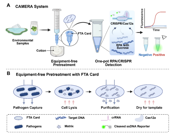 针对这一全球健康领域的迫切需求,上海交通大学医学院-国家热带病研究中心全球健康学院殷堃研究员团队在Chemical Engineering Journal上发表了最新研究成果,开发出名为CAMERA(CRISPR/Cas Assay with Multifunctional Equipment-free Pretreatment and Portable Application)的一体化检测平台。该平台通过集成免设备的样品前处理与一管式CRISPR检测,实现了对水传病原体的超灵敏、定量、可视化现场检测,为生物安全监测提供关键技术方案。