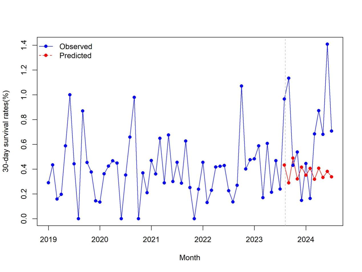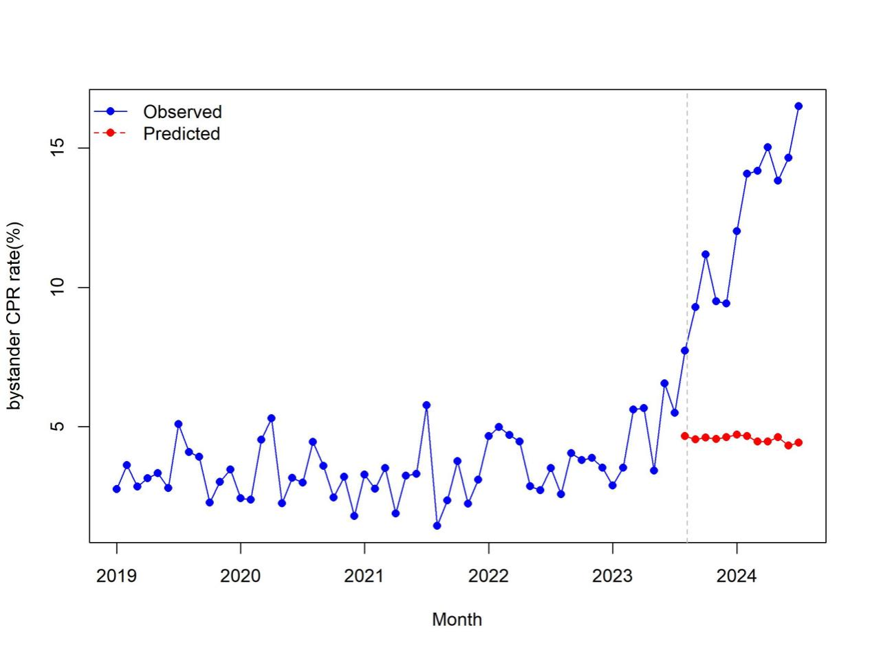 为了解决时间序列中的非平稳性、自相关性和季节性问题,研究构建了一个带有外生输入变量的自回归集成移动平均(ARIMA)模型。将DA-CPR政策的实施作为外生变量被纳入ARIMA模型框架,分析政策实施前后患者自主循环恢复(ROSC)率及30天生存率的变化趋势。此外,通过反事实分析直观展示该政策的影响。