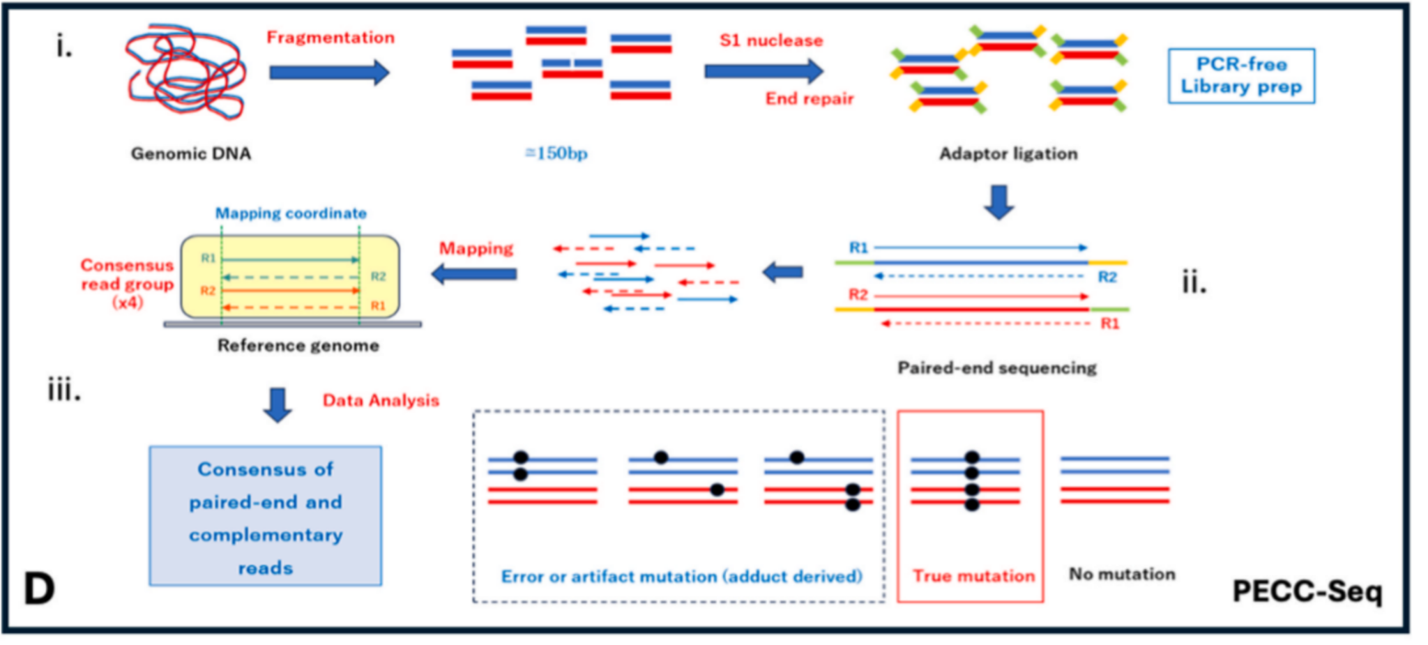 本研究采用的PECC-Seq(Paired-End and Complementary Consensus Sequencing)技术,是团队于2023年在核酸研究领域顶级期刊《Nucleic Acids Research》(doi: 10.1093/nar/gkad909.)上发表的原创性高通量、高精度突变检测方法。该技术通过对同一DNA双链分子的正反链进行配对一致性测序,将测序错误率降低至10-8以下,实现了全基因组范围内极低频体细胞突变的直接、精准定量。在近期一篇关于ecNGS技术用于监管遗传毒性评估的权威综述中,PECC-Seq被列为核心技术之一。该综述明确指出,ecNGS技术通过直接、高灵敏度地测量突变频率和频谱,解决了传统技术的局限性。文章强调,ecNGS为遗传毒性危害识别和风险评估带来了变革性潜力,其高分辨率数据不仅便于定量分析剂量-反应关系,还能解析突变特征谱,揭示致突变作用模式,从而为监管决策提供更丰富、更可靠的机制性见解。PECC-Seq因其无需外源分子标签、PCR-free建库以及在全基因组SNV检测和突变谱分析方面的有效性被重点介绍。