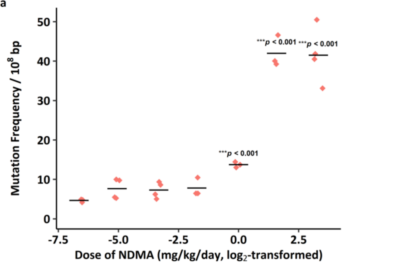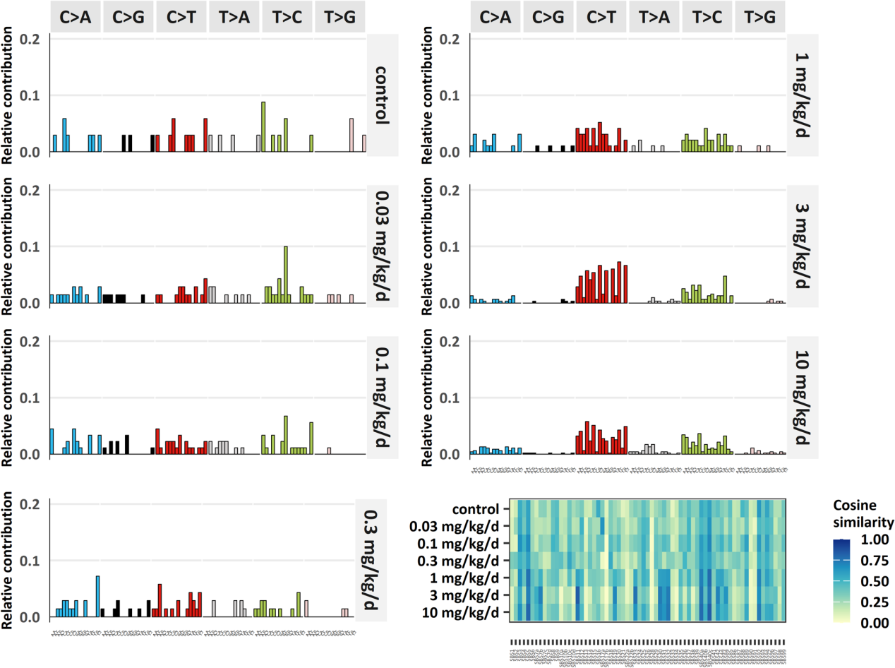 本研究通过高精度LC-MS/MS定量NDMA诱导的DNA加合物(N7-Me-Gua和O6-Me-Gua),并利用PECC-Seq检测小鼠肝脏组织中的全基因组体细胞突变。研究发现NDMA诱导的DNA加合物和体细胞突变均呈现剂量依赖性增加,突变频率在≥1 mg/kg/day剂量组出现显著升高。NDMA主要诱导CG>TA和TA>CG碱基转换,其突变谱与COSMIC Signature 11(烷化剂特征)高度相似,从分子机制上印证了其烷化致突变属性。