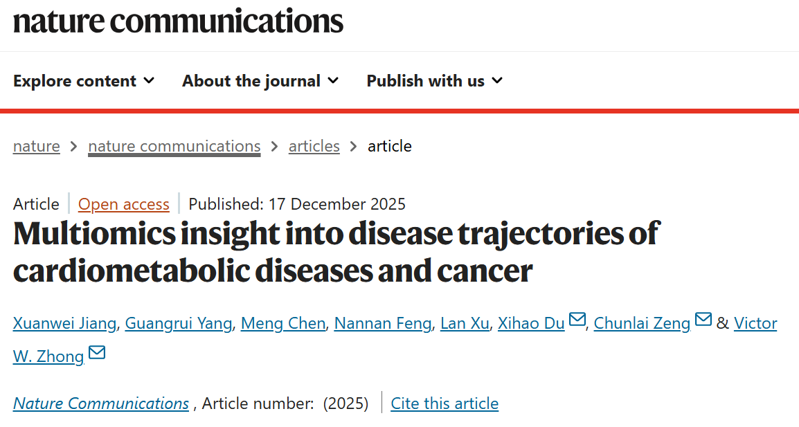 近日,上海交通大学公共卫生学院钟文泽/杜喜浩课题组联合丽水市人民医院曾春来教授团队在国际综合性期刊Nature Communications发表题为“Multiomics insight into disease trajectories of cardiometabolic diseases and cancer”的研究成果,系统描绘了心血管代谢疾病与癌症的共病发生进展轨迹、死亡风险及其组学特征。