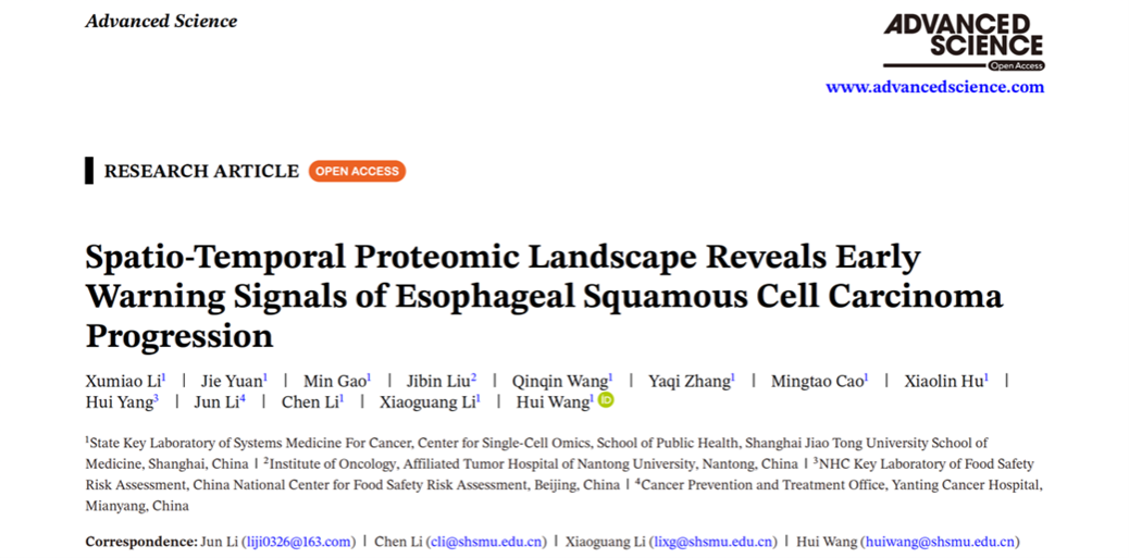 近日,上海交通大学公共卫生学院/单细胞组学与疾病研究中心王慧/李晓光/李辰团队合作在国际知名综合性期刊Advanced Science在线发表了题为“Spatio-Temporal Proteomic Landscape Reveals Early Warning Signals of Esophageal Squamous Cell Carcinoma Progression”的研究论文。该研究通过基于激光捕获显微切割(LCM)技术的空间分辨蛋白质组学方法构建了食管鳞状细胞癌(ESCC)早期发生进展的时空蛋白质组学图谱,涵盖了炎症、鳞状上皮异型增生和鳞癌等多个关键阶段。基于组学数据分析、临床样本验证和体内外功能学实验,该研究系统揭示了ESCC早期发生进展过程中的关键蛋白质变化并发现中度异型增生阶段可作为早期干预窗口期,筛选并验证了七种关键的早期预警生物标志物,同时提出了靶向PARP1-TP63-GBP6轴的早期干预新策略,为ESCC的早期诊断、随访监测及早期干预提供了重要科学依据。