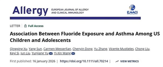 哮喘是儿童和青少年中最常见的慢性非传染性疾病,其患病率在不同地区和国家存在显著差异,环境因素在其中发挥着关键作用。全球范围内,许多国家在公共饮用水中添加氟以预防龋齿,通过增强牙釉质再矿化来减少龋齿的发生。此外,氟还广泛用于牙膏、漱口液等日常口腔护理产品。然而,过量摄入氟不仅会导致氟斑牙,还可通过氧化应激和炎症机制引发免疫疾病。职业研究发现,长期高剂量氟暴露可增加哮喘的发生风险,但尚无研究探讨长期低剂量氟暴露是否增加儿童、青少年哮喘的发生风险。近日,公共卫生学院汪一心研究员联合国际团队,利用多维度氟暴露指标(血氟、尿氟、饮水氟、氟补充剂摄入、氟斑牙),发现在烟草暴露的儿童和青少年中,血浆氟、氟补充剂摄入、氟斑牙与哮喘风险增加之间存在显著的暴露-剂量反应关系。研究成果发表于欧洲过敏和临床免疫学会 (EAACI)官方杂志、全球过敏与免疫学领域权威期刊Allergy,为全球饮用水加氟标准的重新评估提供了重要的科学依据。