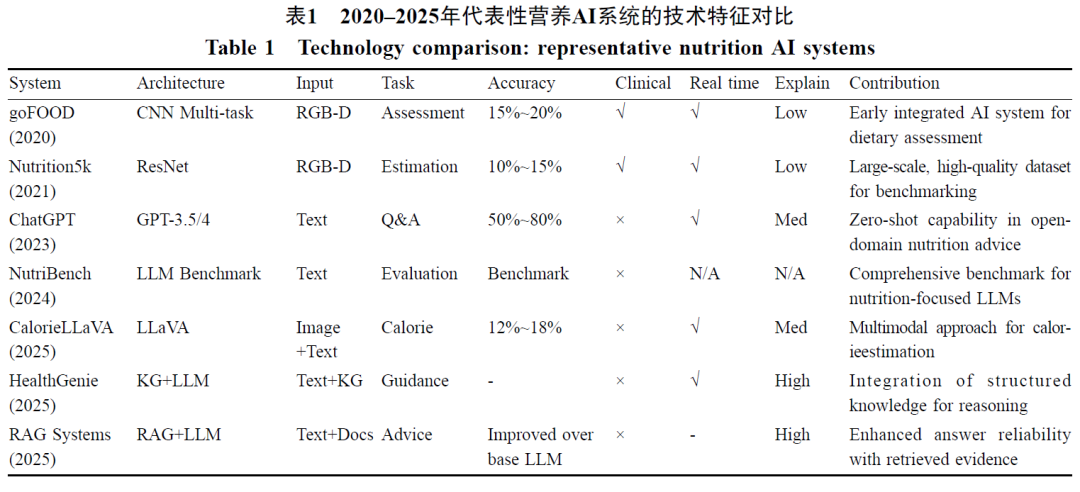 表1对比了2020–2025年间具有代表性的营养AI系统及其核心特征,并展示了早期以计算机视觉为主的膳食评估模型(goFOOD™、Nutrition5k),以及近期融合LLM、多模态、知识图谱的新型系统(CalorieLLaVA、HealthGenie、RAG-based等)。从中可以看出,不同系统在架构类型、输入模态、主要功能任务等方面各具特色。从表1的对比中还可以发现几个值得关注的共性趋势:其一,目前多数系统尚缺乏严格的临床验证,列举的7个系统更多停留在离线实验、用户研究或技术验证阶段;其二,实时性和多模态能力在新近系统中已成为标配,说明营养AI应用正朝着即时交互和数据多源融合方向发展;其三,可解释性和知识融合逐渐受到重视,2025年的几个系统通过引入知识图谱、RAG等方式提高了模型决策的透明度和可信度。