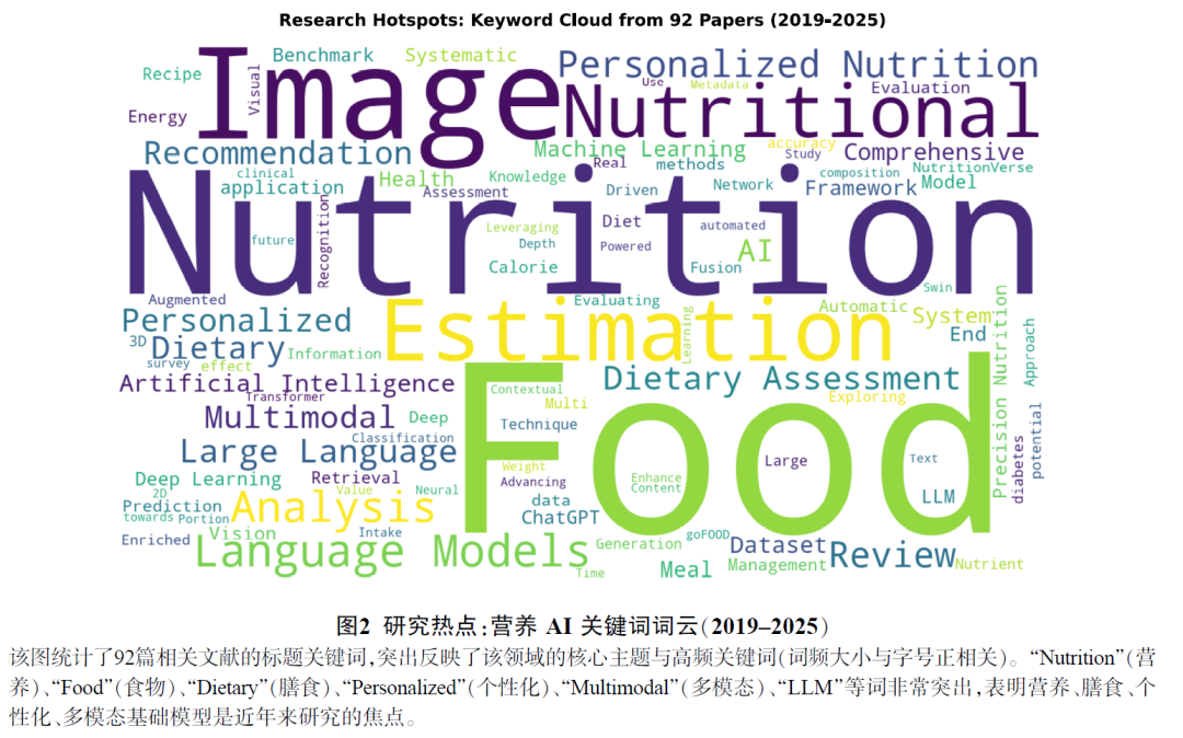 “营养”“膳食”“个性化”“多模态”“LLM”等是近年来文献中高频出现的词汇,体现了研究的关注焦点(图2)。可以预见,随着研究的深入,这些热点主题将继续发展,并产生更多交叉融合的新课题。