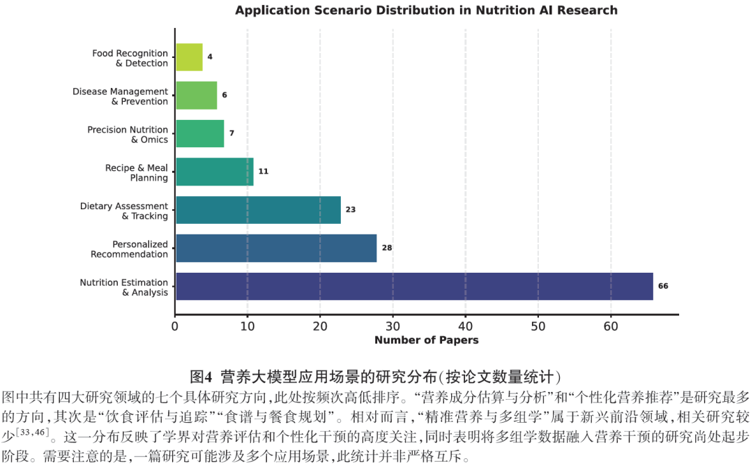 营养大模型的最终价值在于其落地应用的实际成效。学术界的研究应用主要聚焦于前后协同的四大研究领域:自动化食物识别与记录、膳食成分分析与营养评估、个性化精准营养推荐及临床疾病营养干预。其中,营养评估领域进一步细分为饮食评估与追踪等具体研究方向,而个性化精准营养推荐则包括了食谱与餐食规划等细化的应用场景。图4展示了各应用场景相关研究在该领域的文献占比分布。
