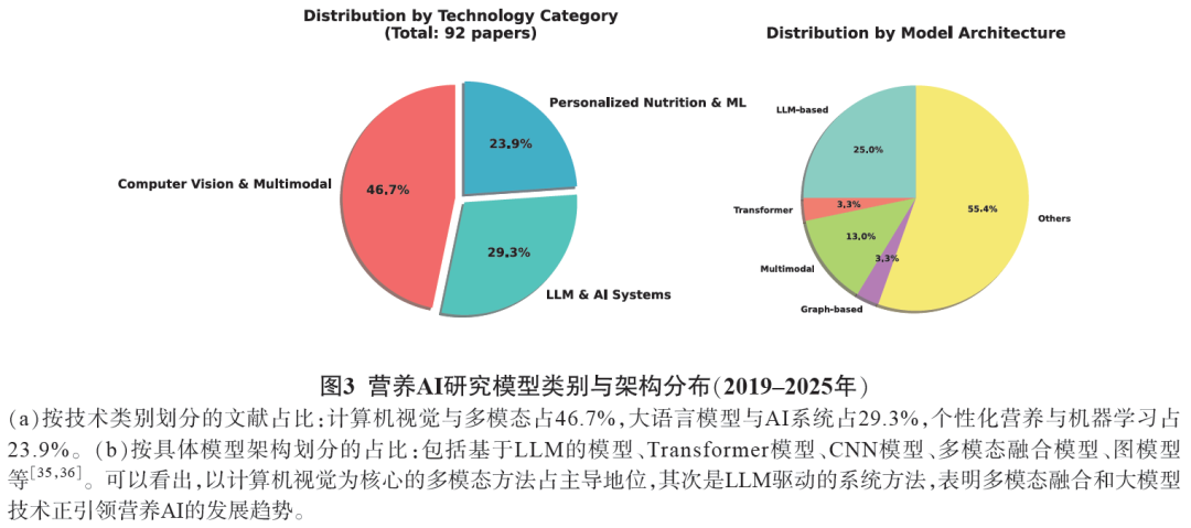 营养领域的大模型架构可按技术范式分为三类(图3):(a)基于计算机视觉的多模态感知模型,即以图像分析为核心,整合文本等多源模态信息的架构;(b)以LLM为核心的智慧系统,侧重于处理营养文本理解、交互式问答与逻辑决策;(c)融合传统机器学习与领域知识的个性化模型,包括利用临床数据、知识图谱构建的混合驱动范式。根据92篇核心文献的统计显示,计算机视觉与多模态感知方向的研究最为活跃(占比46.7%),LLM及其系统集成研究占比29.3%,其余23.9%属于个性化营养与常规机器学习范畴(图3)。这一分布表明,视觉感知能力仍是营养AI的基础,而具备复杂推理能力的LLM正成为前沿趋势。在具体架构层面,研究广泛涵盖了改进型CNN(主要用于图像任务)、视觉与语言协同Transformer(用于序列建模和跨模态对齐)、图神经网络(用于营养知识图谱推理)以融合多种子模块的复杂系统架构。