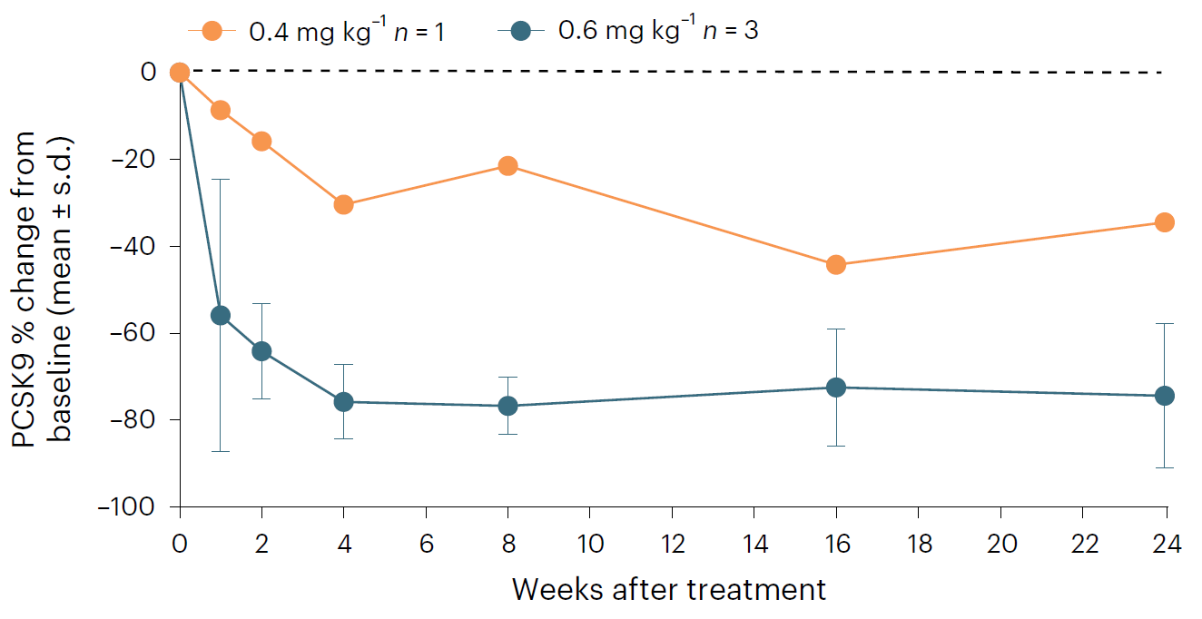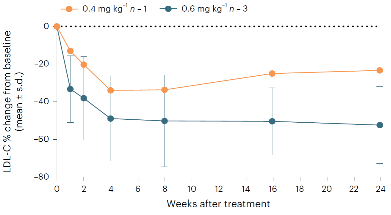 本次临床试验共纳入6例患者,分为0.2、0.4、0.6 mg/kg三个剂量组开展研究,从有效性和安全性两大维度验证了该基因治疗手段的临床价值。有效性数据显示,0.6mg/kg 高剂量组患者在接受治疗后24周,血清PCSK9水平平均降低74.4%,血清低密度脂蛋白胆固醇(LDL-C)水平平均降低52.3%,且降脂疗效持续稳定。安全性方面,临床试验中未发生3级及以上不良事件,也无患者因不良事件退出研究。患者出现的最常见不良反应为发热、肌痛等输注相关反应,均可在24小时内自行缓解;部分患者出现的转氨酶一过性升高,通常在短期内恢复正常。此外,研究团队通过多维度技术全面评估脱靶风险,未检测到DNA或RNA水平的脱靶编辑,证实了该治疗手段的精准性。