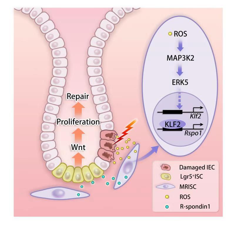 新型肠道间质细胞MRISC感受损伤信号,增强干细胞组织修复的工作示意图(苏冰教授课题组供图)