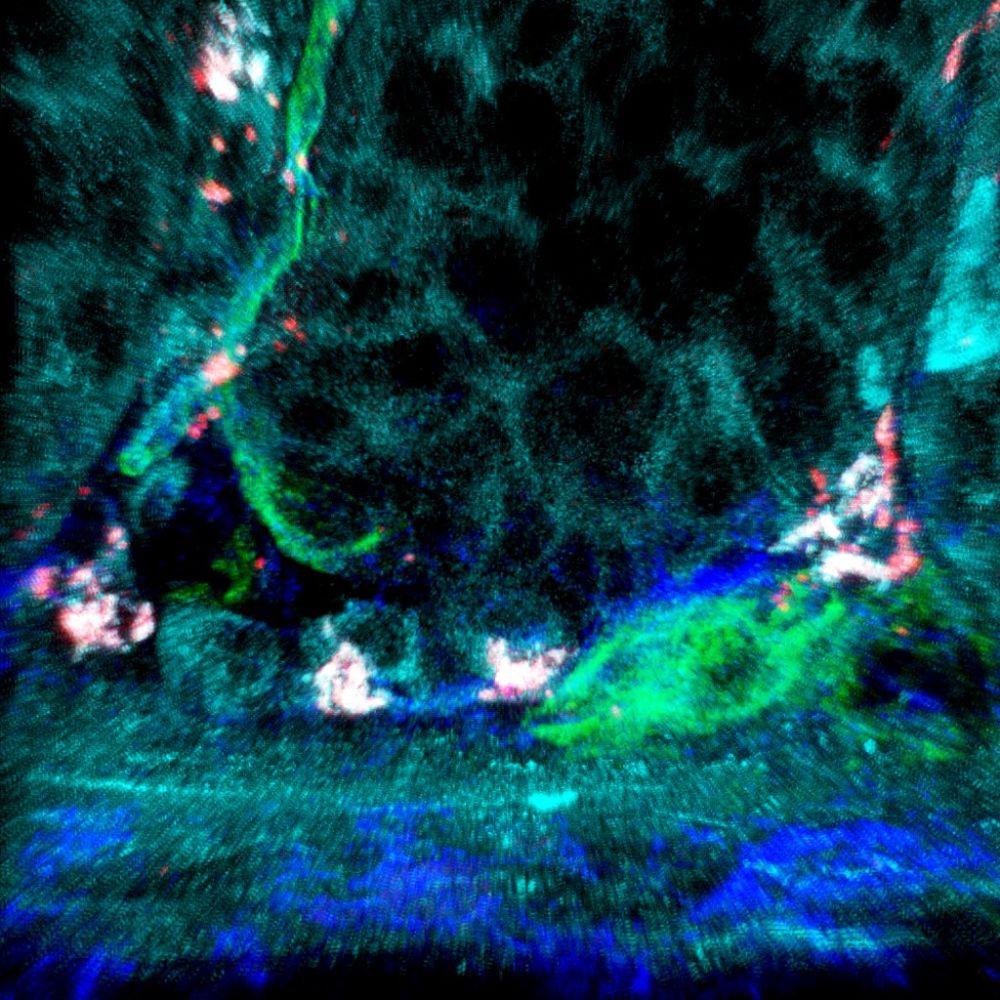 免疫荧光图片显示新型肠道间质细胞MRISC(白色)定位于肠道干细胞底部。(苏冰教授课题组供图)