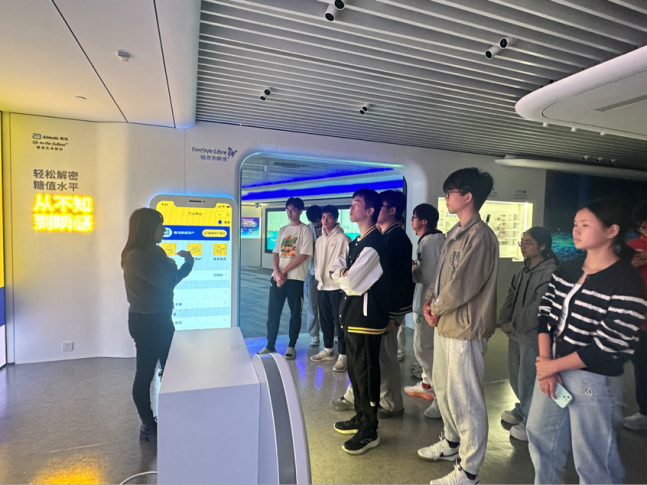 同学们分为两批依次参观中心内的先进设施与研发环境,近距离感受医疗科技的前沿魅力。在参观过程中,同学们通过雅培专业人员的讲解,对这家拥有超过130年历史的全球医疗健康公司有了更全面的认识。雅培的业务广泛覆盖药品、营养品、诊断和医疗器械四大核心领域。在高度仿真的模拟实验室里,大家近距离观察了雅培先进的临床检验系统,其高效、精准的自动化工作流程,能够快速为儿科等临床科室提供关键的诊断依据。此外,同学们还了解到雅培在心脏节律管理、结构性心脏病介入等专业器械领域的前沿科技,以及为不同人群提供全面支持的医学营养解决方案,深刻感受到了医疗科技在人类健康全周期管理中的广泛应用与卓越价值。