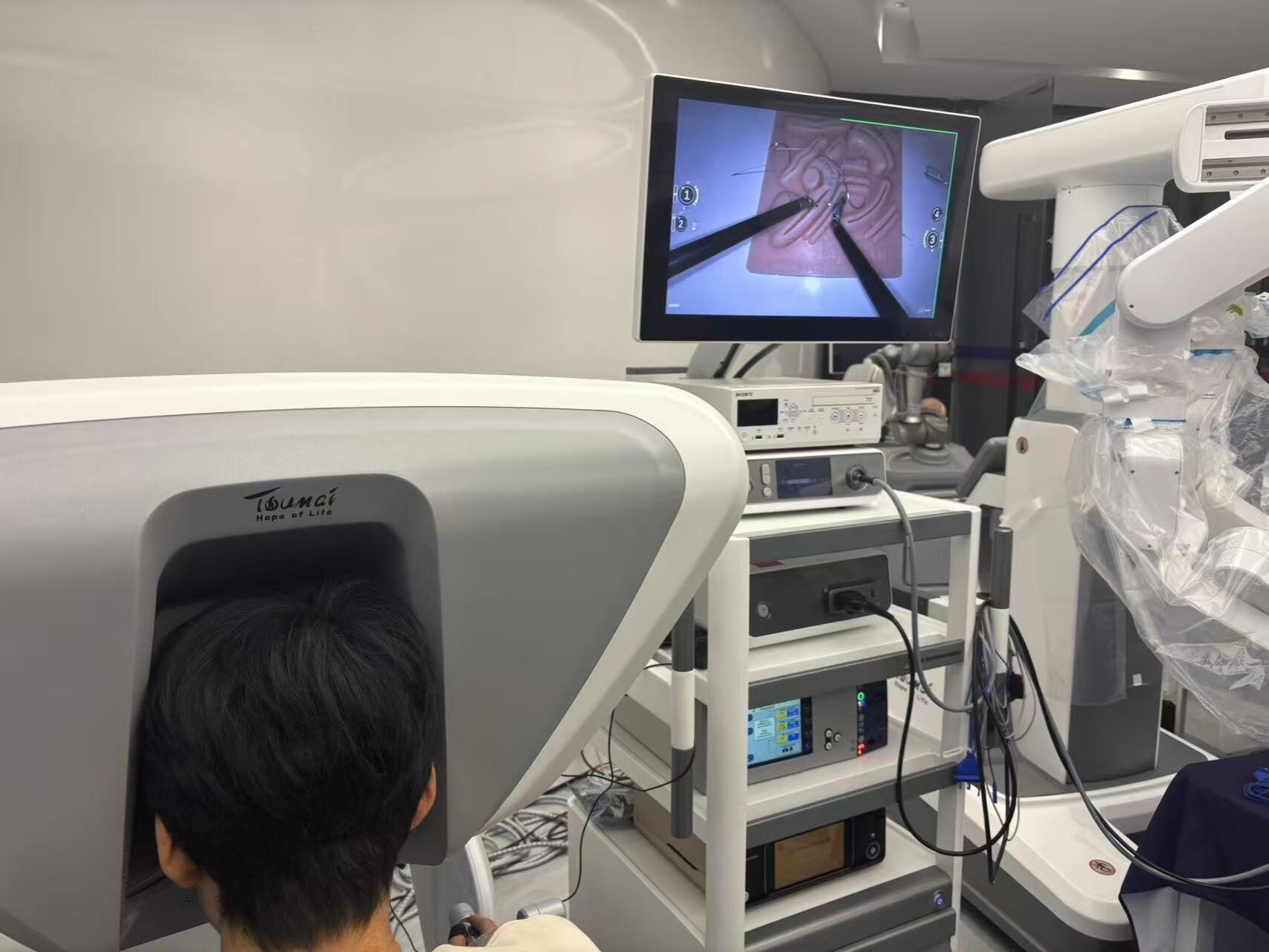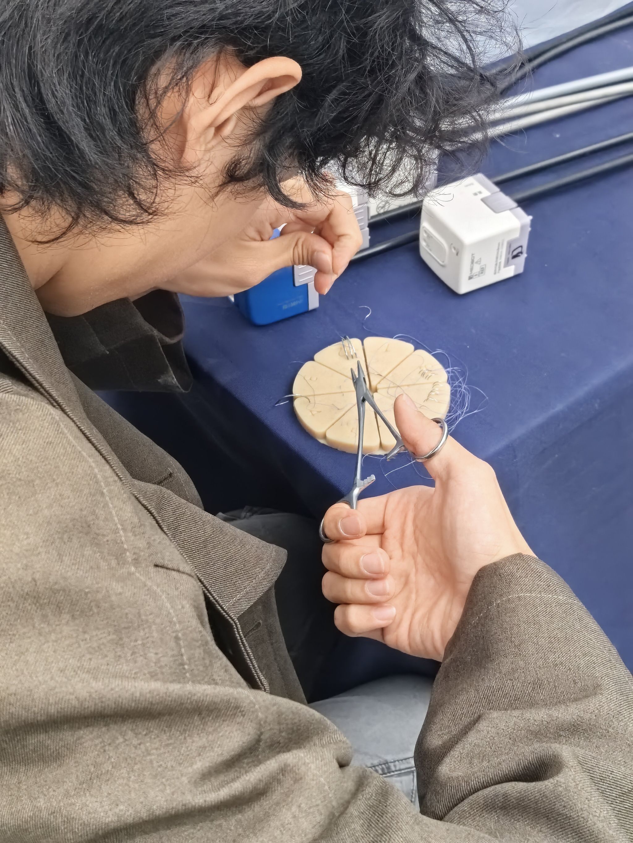 在徐老师鼓励下,同学们分组在三台设备上进行拾物套圈练习,亲手操控中直观感受其稳定精准,现场氛围专注热烈。不少同学已能连贯完成基础缝合,部分主动挑战高难度管腔缝合,未操作的同学则围屏密切观察学习。