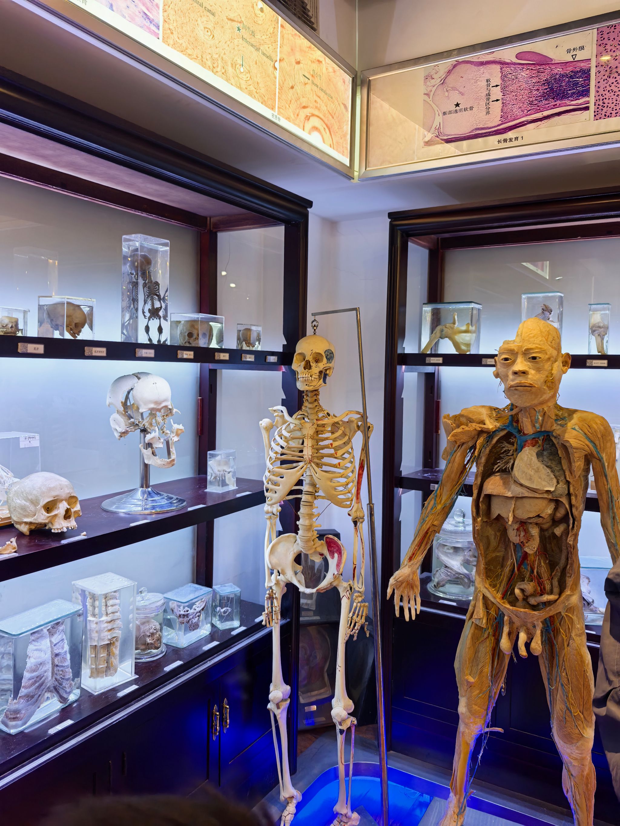 复旦大学人体科学馆珍藏了逾千件珍贵的人体标本。在张红旗老师的专业讲解下,同学们依次参观了从胚胎发育到各系统器官的系列标本,涵盖了完整的骨骼系统、精巧的血管灌注标本以及距今数百年的明代古尸等。当课本上的肝小叶、肾单位等结构以实物的形式清晰地呈现在眼前时,抽象的理论知识瞬间变得具体而深刻,实现了课堂所学与临床所见的有力呼应。