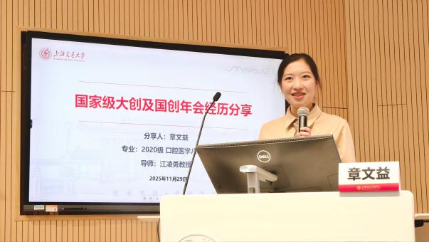 11月29日,上海交通大学医学院“医路启新,创享成长”创新项目朋辈分享会在闵行校区东上院100号报告厅成功举办。2021级临床医学八年制曹宸语、陈泽瑜,2023级医学检验技术李镇羽2020级口腔医学八年制(口腔医学方向)章文益受邀主讲,医学院近300名本科生线下、线上同步参与,共同探索“大创”项目,吸取科研经验,解密专利申请,了解科创赛事。本次活动由2025级本科生郑李千易主持。