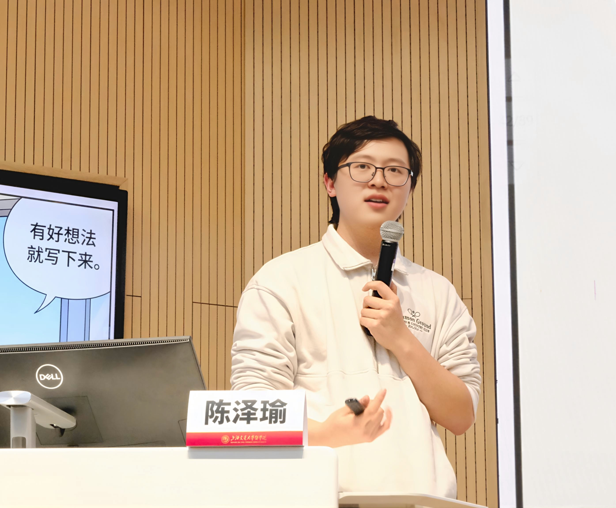 曹宸语以时间线为脉络,还原了从科研启蒙到项目落地的过程:从大一时通过选修课萌发科研兴趣、大二加入课题组参与RBL项目,再到以该项目为基础申报“医创赛”项目,拆解了“寻找导师、联系沟通、确定方向、设计实验、开展研究、备战竞赛”六大环节。此外,他还围绕“如何看待本科生科研”展开深度分享,鼓励同学们抛开被动学习观念,在科研中主动探索;并着重强调相较于发表文章、斩获竞赛成绩,科研兴趣的培养与科研思维的成长,才是本科生在科研道路上最宝贵的收获。
