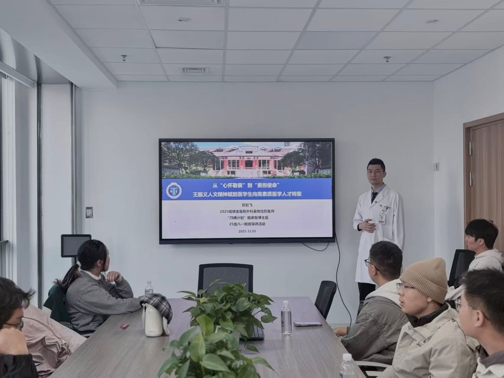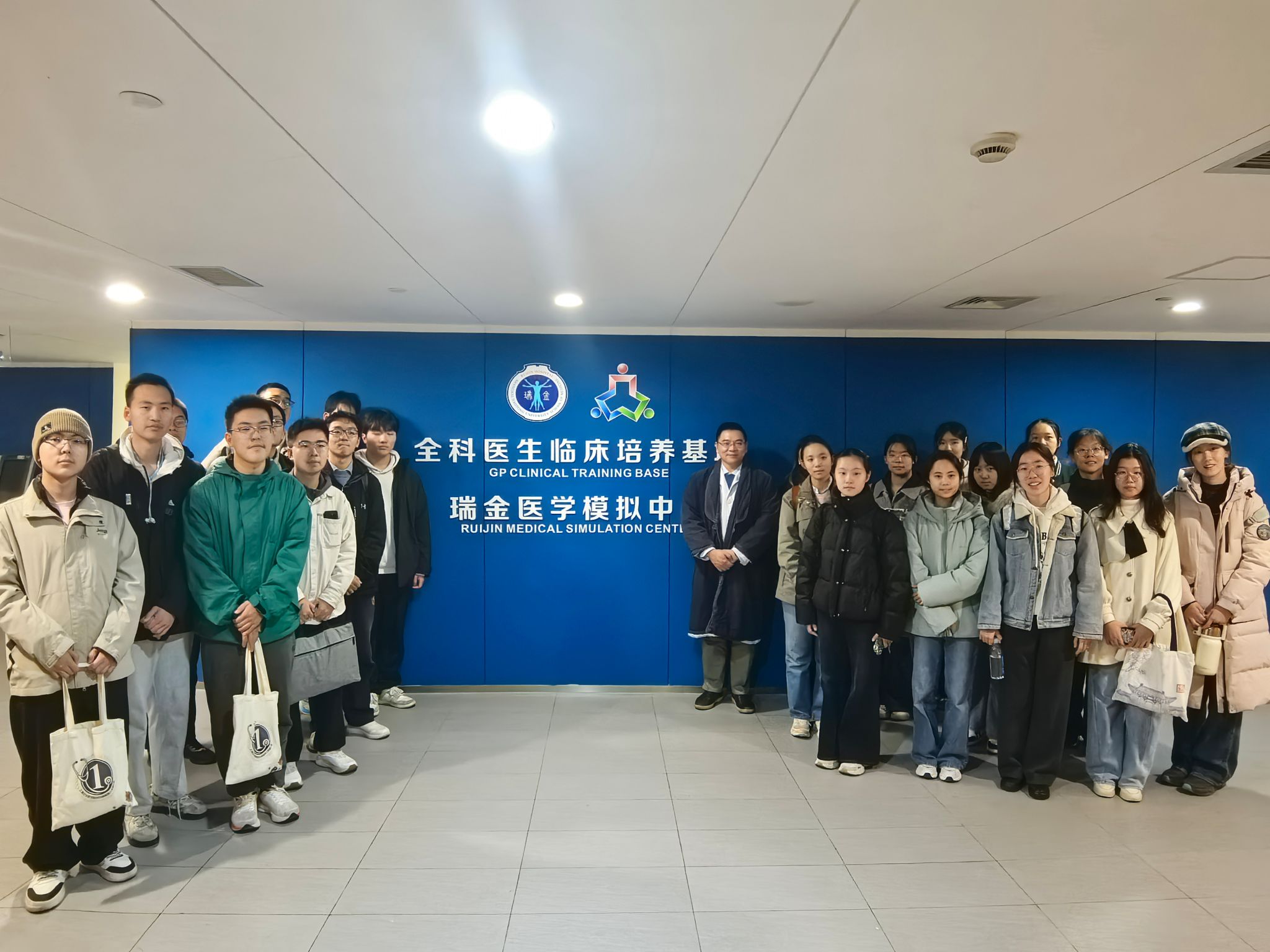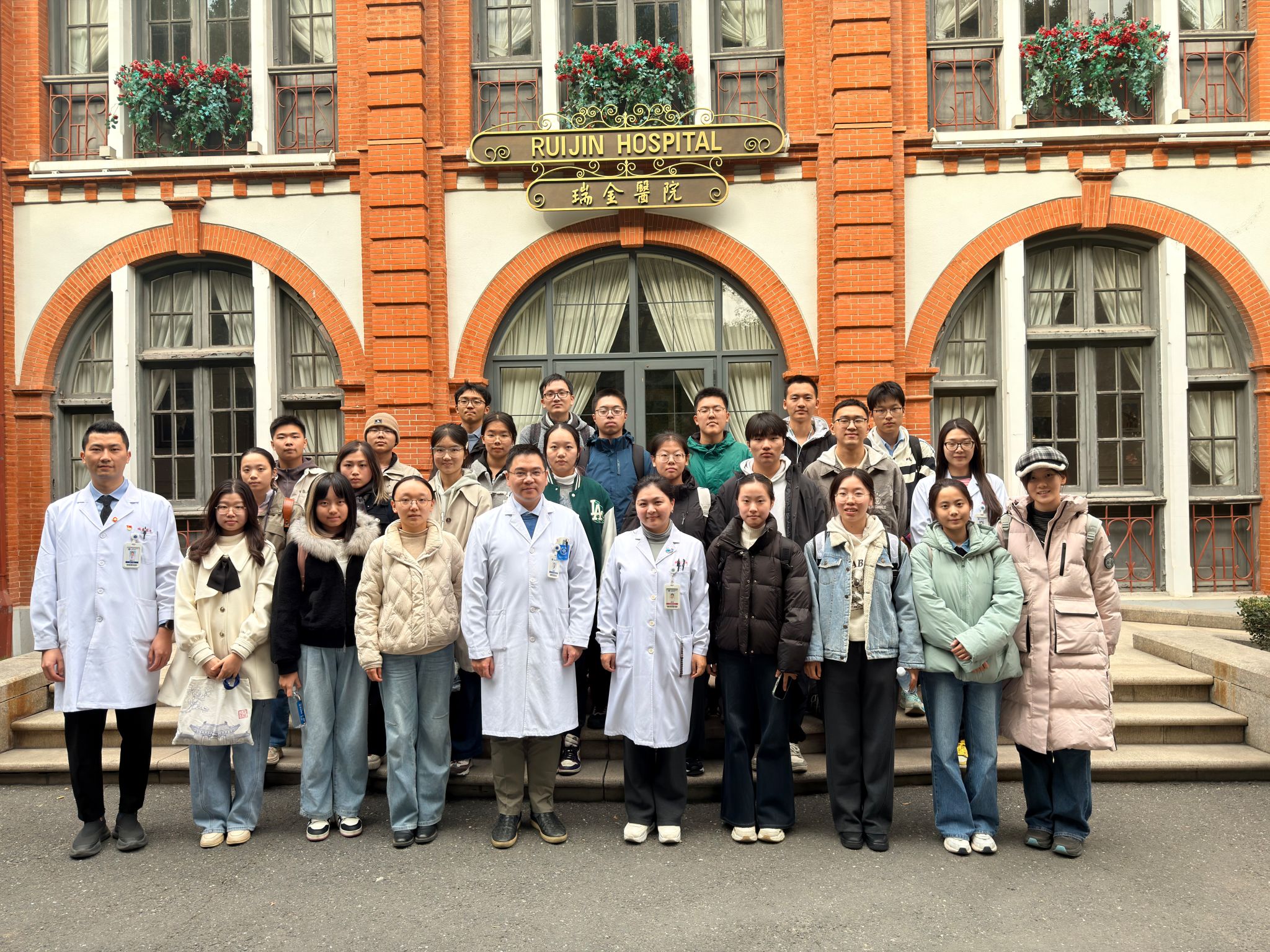 为厚植医学人文情怀,精进临床实践技能,12月5日,上海交通大学医学院2025级临八一班的同学们在附属瑞金医院消化外科主任医师、班导师孙晶老师的带领下,开展了一次沉浸式职业体验班导师活动,同学们走进瑞金这片医学沃土,切身感受其跨越百年的厚重历史与浸润在日常医疗中的医学人文温度,临八一班辅导员刘乐诗、瑞金医院外科基地住院医师邵岩飞共同参与了本次活动。