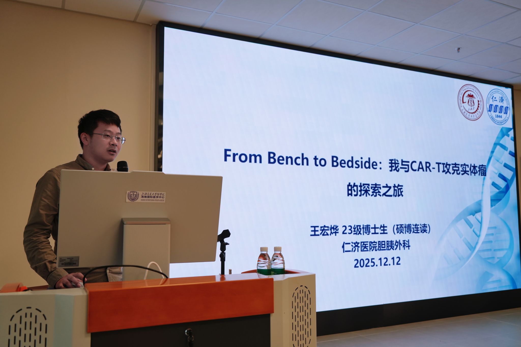 2023级博士生王宏烨以《From Bench to Bedside:我与CAR-T攻克实体瘤的探索之旅》为题,生动讲述了从基础研究到临床应用的转化医学实践。他深度参与研发的CAR-T细胞治疗药物已进入临床试验并获FDA批准,相关成果作为封面文章发表于Science Translational Medicine。王宏烨强调“懂临床,才知道真正的科学问题”,指出未来医学创新人才应兼具临床洞察、基础科研与转化开发等多维能力。