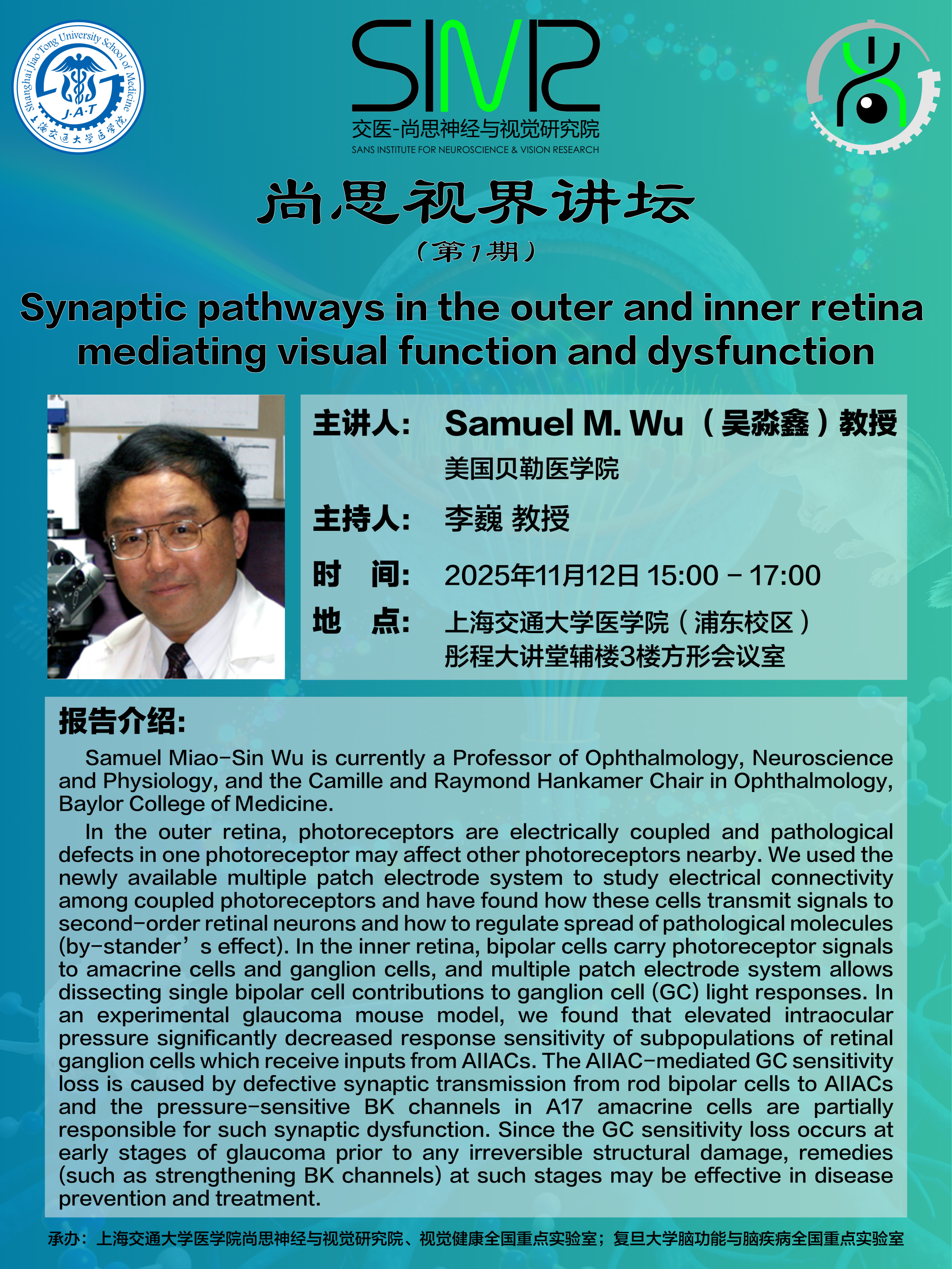 尚思视界讲坛:Synaptic pathways in the outer and inner retina mediating visual function and dysfunction
