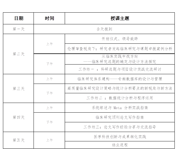 1.培训内容:临床研究与课题申报的伦理审查、临床研究选题与设计、临床研究设计策略与统计分析、临床顶刊论文撰写、专病数据库建设与科技成果转化方法等。