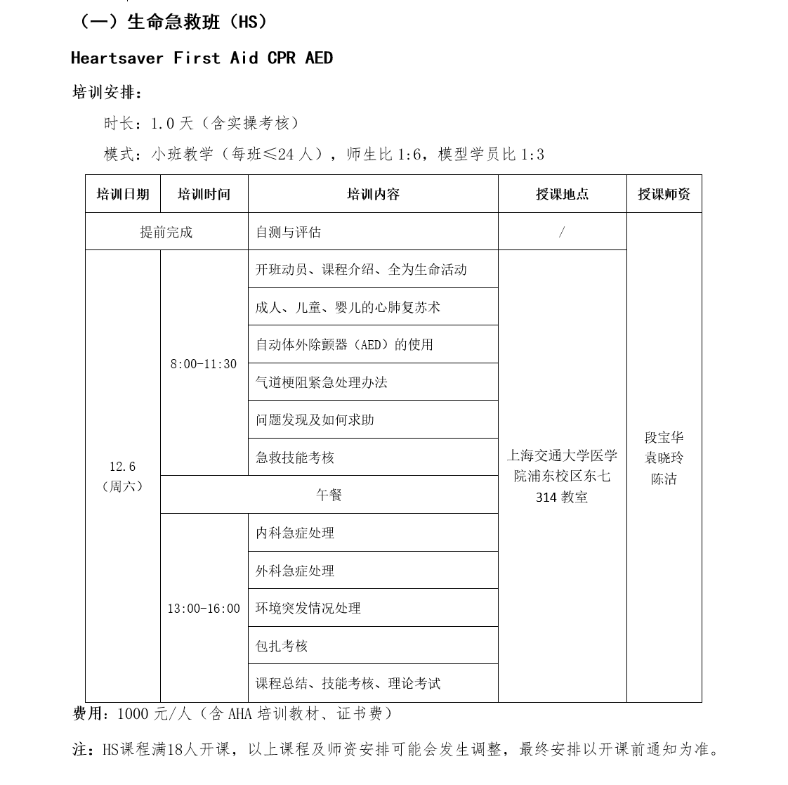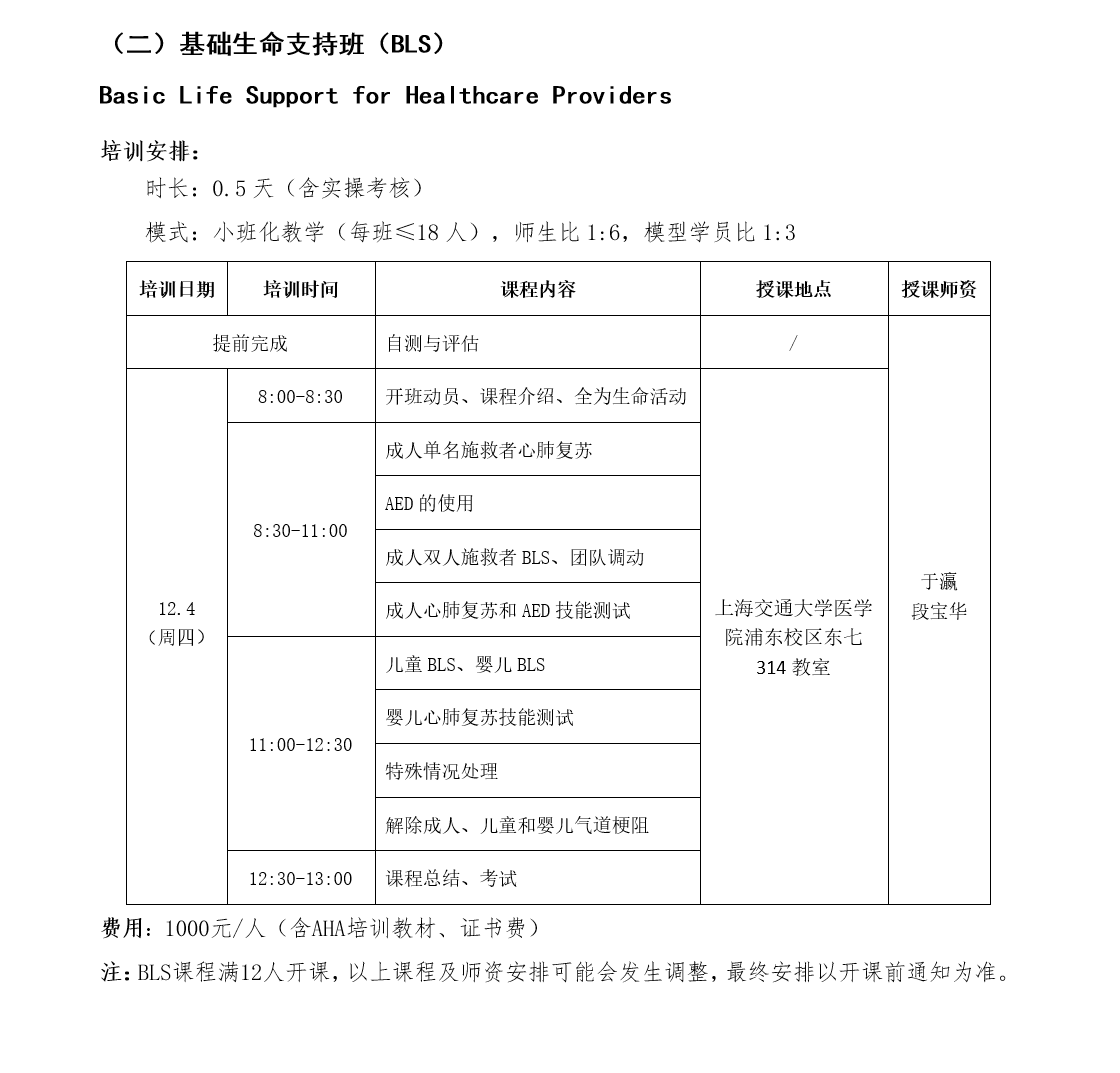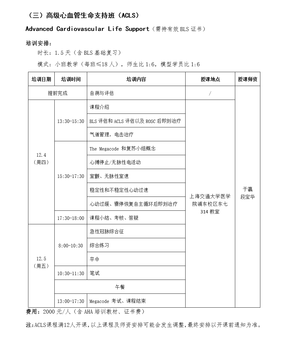 注:BLS+ACLS联培课程满12人开课,以上课程及师资安排可能会发生调整,最终安排以开课前通知为准。