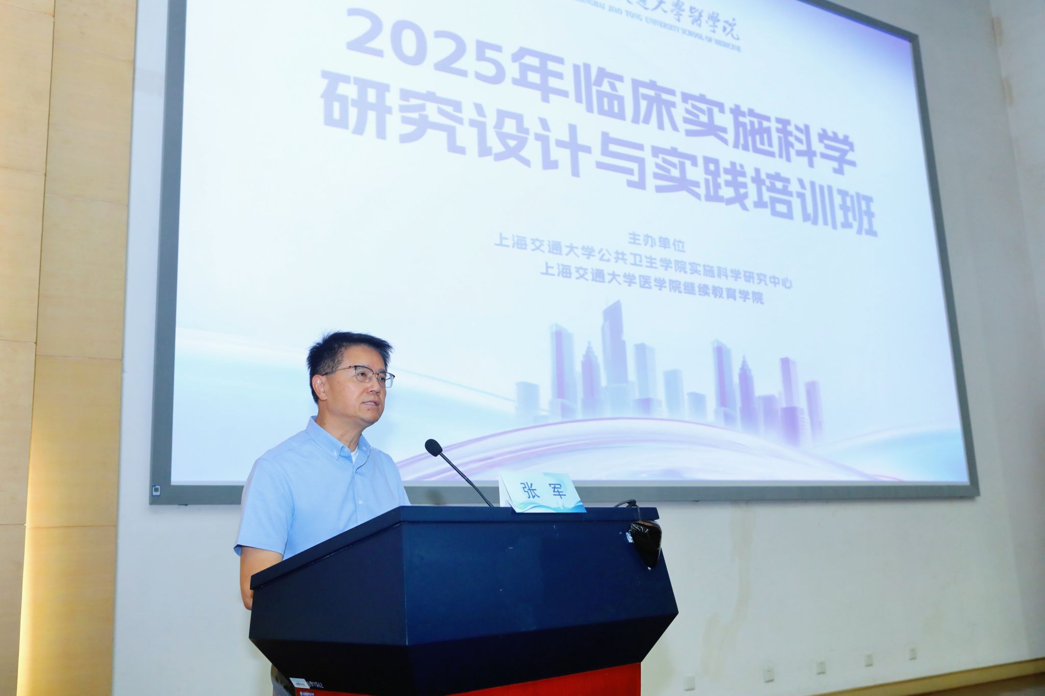 随后,上海交通大学公共卫生学院实施科学研究中心副主任、教授张军致辞。他指出,实施科学是连接科研成果与临床实践的关键纽带,尤其是在当前以解决真实世界问题为核心,推动循证医学向实践转化的时代。本次培训依托交大医学院的临床资源与跨学科优势,聚焦理论-案例-实操深度融合,助力学员全面掌握从研究设计到成果落地的关键技能。同时,期待不同机构的学员能在培训中碰撞思想,将所学转化为推动医疗卫生高质量发展的具体方案。