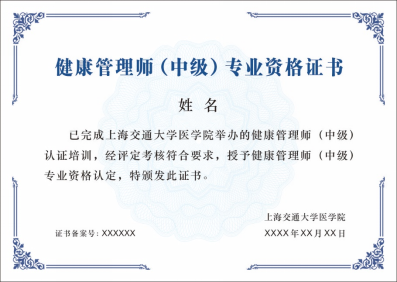 2.证书发放:完成全部课程学习及随堂练习且考核通过后,颁发上海交通大学医学院《健康管理师(中级)认证书》(可在学院官网查询验证)。