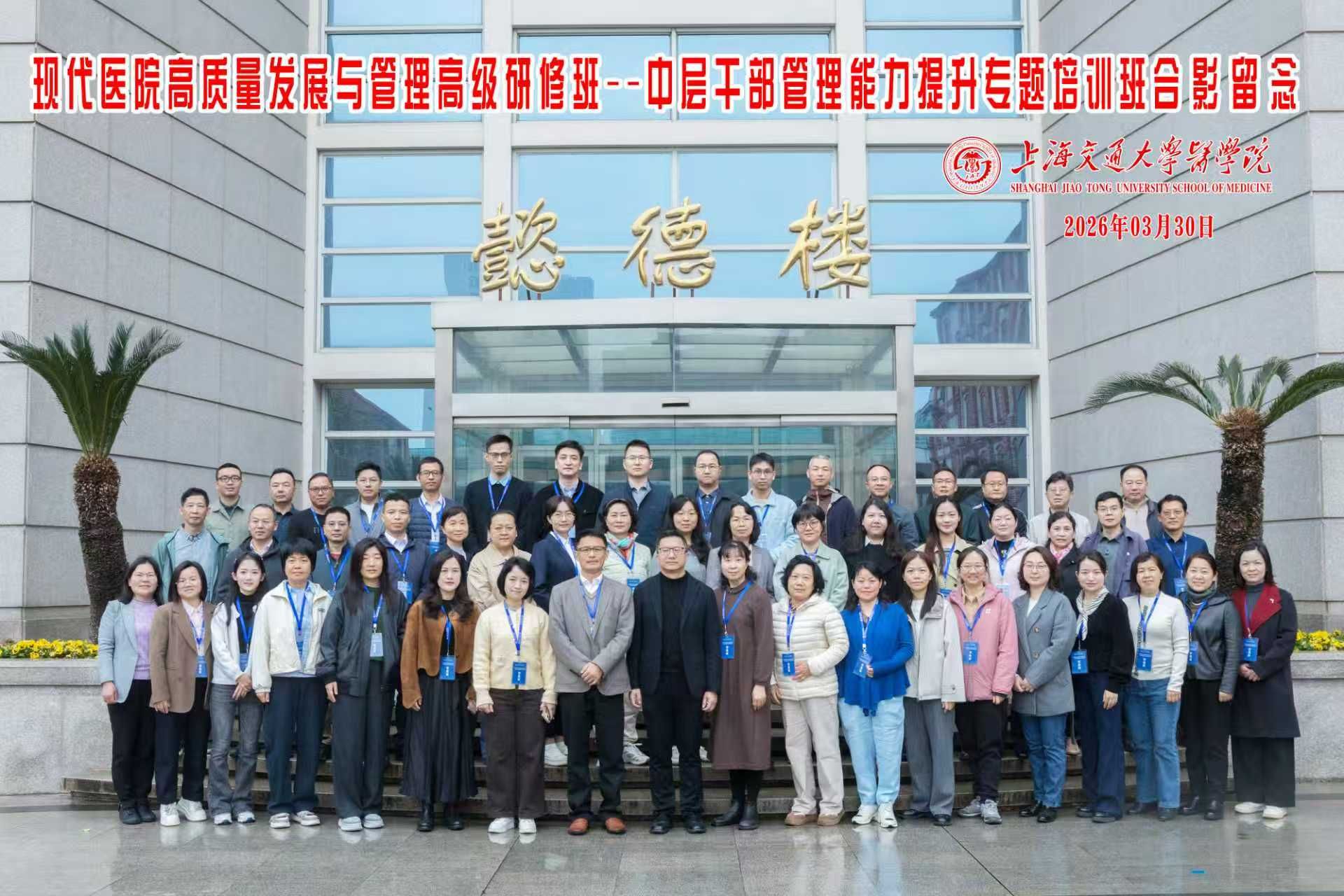 春潮启新程,笃学促发展。3月30日,由上海交通大学医学院主办的现代医院高质量发展与管理高级研修班——中层干部管理能力提升专题培训班在医学院正式开班。本次培训精准对接基层医疗管理发展需求,为深圳市南山区医疗集团社康主任等中层管理干部量身打造学习提升平台,旨在以先进管理理念和实践经验赋能基层医疗高质量发展。上海交通大学医学院继续教育学院党支部书记、副院长浦川海,深圳市南山区医疗集团总部品质提升部副部长许全成出席开班典礼并讲话。开班典礼由医学院继续教育学院医院管理培训中心主任顾国玉主持。