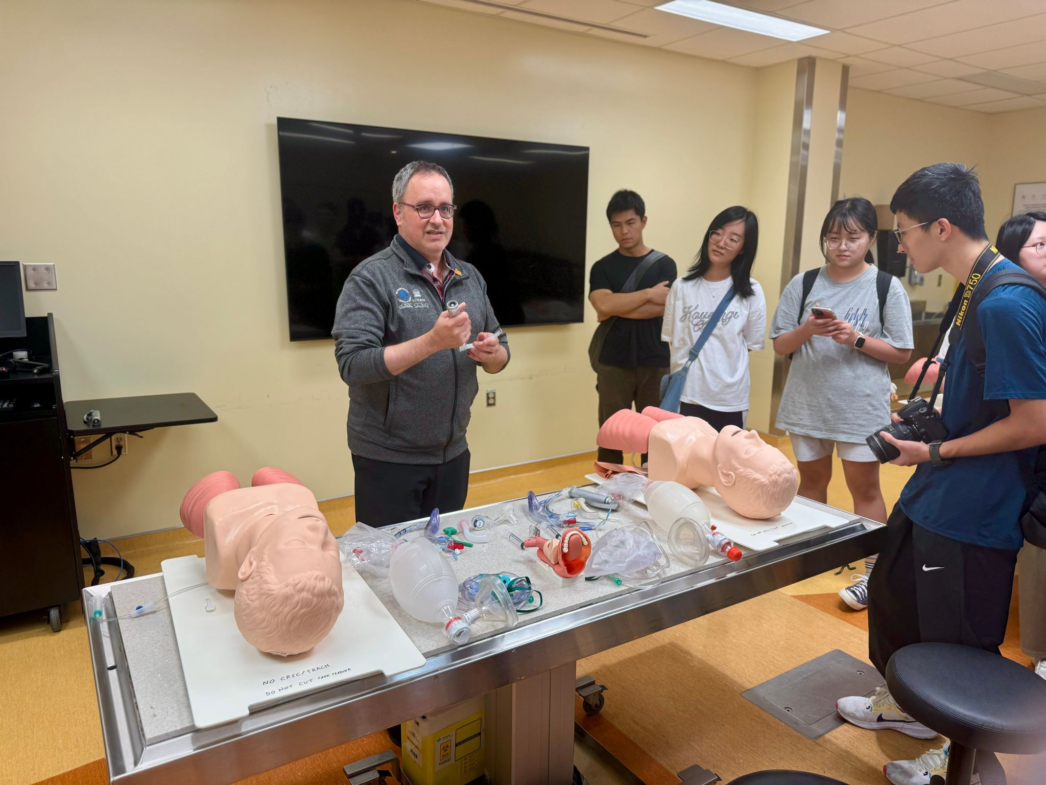 接着,我们来到了多功能室。在这里,同学们在老师的指导下进行了五项模拟活动:内窥镜使用、CPR、心音听诊、超声造影和气管插管的练习。同学们都十分积极踊跃地参与各项活动,在轻松愉悦的氛围中,对这些临床基础技能有了基本的了解,激发了对临床操作的兴趣。活动结束时,大家意犹未尽,在负责人轻松幽默的结束语中结束了本次十分有意义的行程。