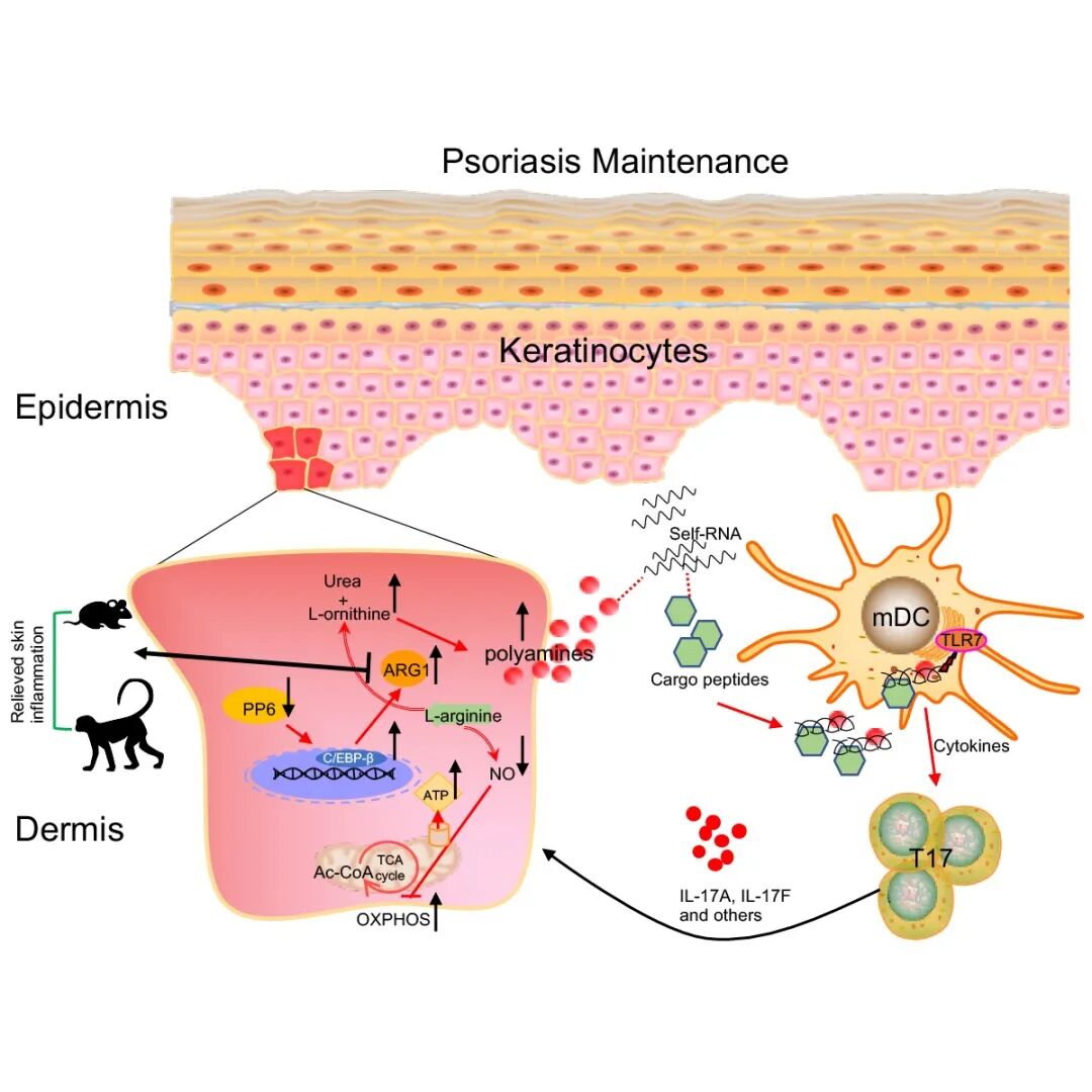 该研究发现,银屑病患者表皮细胞中的丝苏氨酸蛋白磷酸酶-6(PP6)表达水平显著降低,提示PP6的异常表达可能参与银屑病发生发展。研究人员进一步发现:表皮细胞特异性Pp6基因缺失的小鼠自发高度类似人类银屑病的皮肤炎症。Pp6 缺失的表皮细胞精氨酸酶(Arg1)上调导致尿素循环下游代谢物——多胺(Polyamines),异常地在皮肤部位累积。Polyamines携同表皮细胞释放的自身核酸(self-RNA)与具有 RNA 结合能力的短肽形成复合物。来自表皮细胞的“多胺+自身核酸+短肽”复合物形成“自身抗原”进入树突状细胞(DCs)后强烈激活内体中的 Toll 样受体-7,介导 DCs 释放多种促炎因子。皮肤局部注射精氨酸酶抑制剂显著改善小鼠与非人灵长类(NHP)动物模型的类银屑病皮肤炎症。该研究首次揭示,组织特异性细胞的代谢重编程所引起的代谢物异常累积是银屑病等慢性炎症性疾病发生发展的重要“帮凶”,表皮细胞的“多胺+自身核酸+短肽”复合物是激活皮肤免疫反应的“自身抗原”,而靶向调节表皮细胞精氨酸代谢通路的异常有望成为治疗银屑病的全新策略。